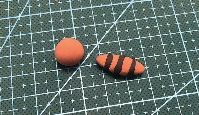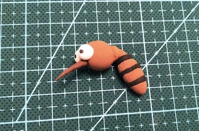取一块棕色粘土揉成球型,这可是蚊子圆圆的小脑袋;再取一块搓成椭圆形,这是蚊子的身体。在给蚊子做身体时千万别忘了给蚊子的身体上缠上几圈细细的花纹哟。