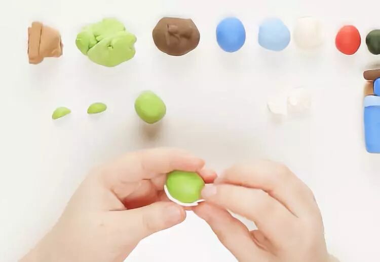接下来,我们要开始装点怪物世界了!植被丛生的怪物乐园,当然少不了各种形状、姿态的小草。取出一大块绿色(黄+蓝)粘土备用,揪出一小块,我们先来做一个简单的!