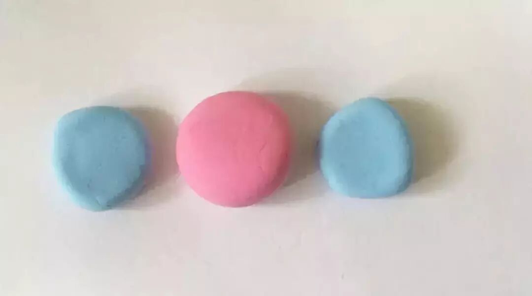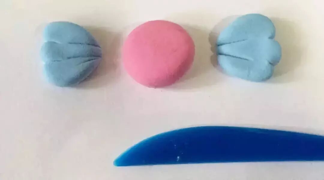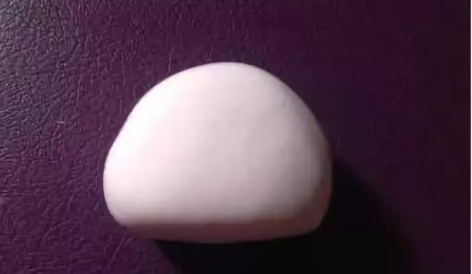 制作步骤:取出粉色粘土,揉成一个球形;然后捏成一个半圆形的,
