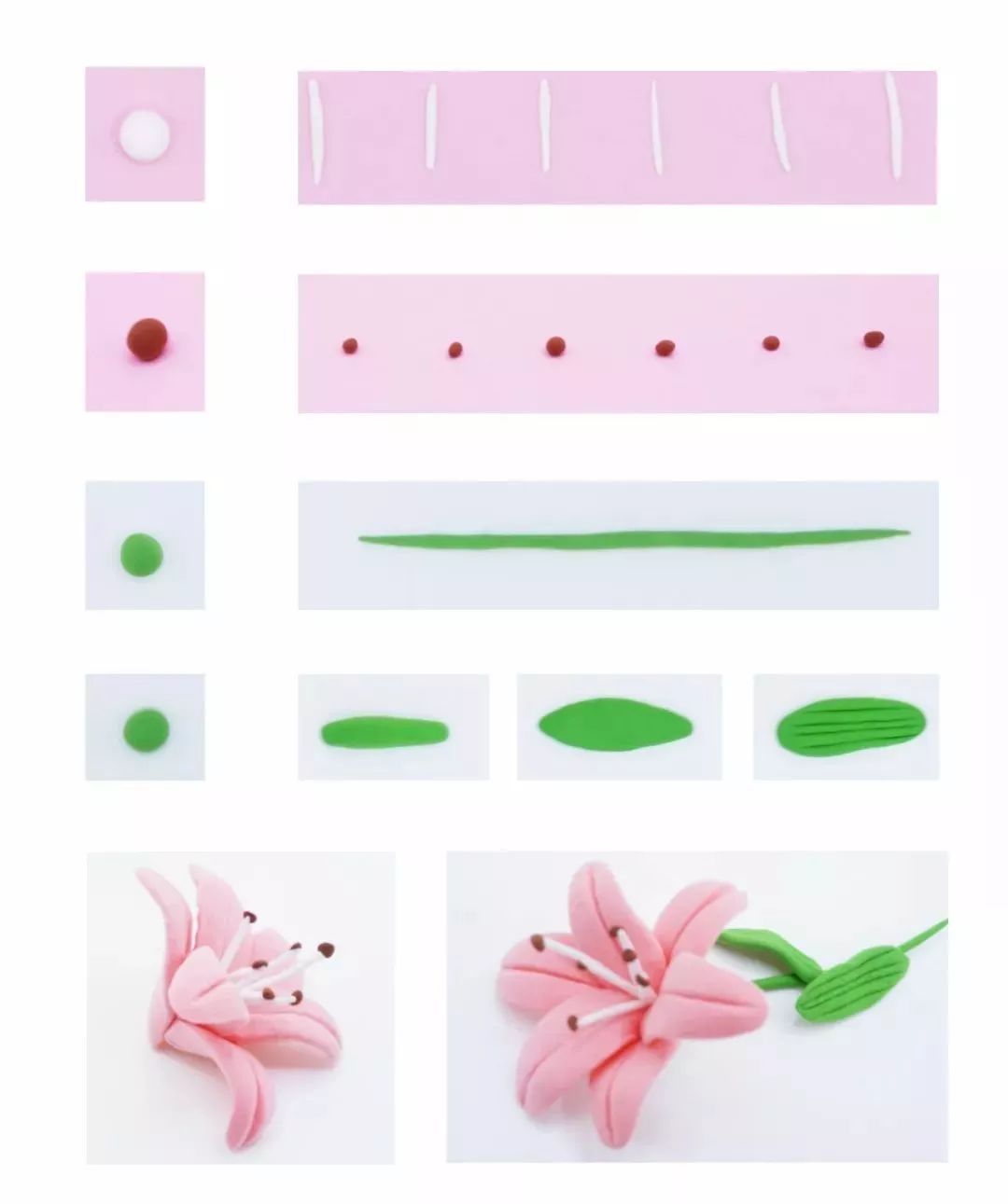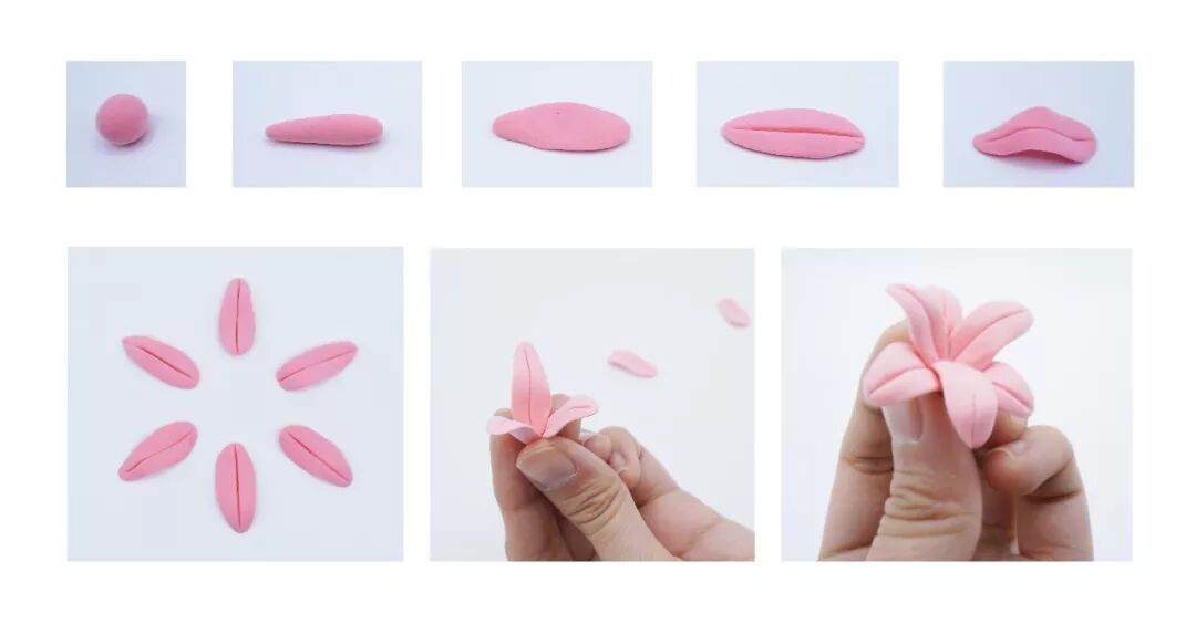 百合花:取一块粉色粘土(红+白),平均分成六块,如图做出六片花瓣(花瓣越薄越好),组装时先将三片花瓣粘在一起,再将另外三瓣插进去。