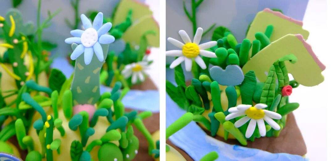 适当在一些小草上加一些小装饰,小草看起来会更加生动美丽。一个颜色的绿未免显得单调,在绿色粘土中加黄色粘土,可以调出浅绿,在绿色粘土中加蓝色粘土,可以调出深绿。