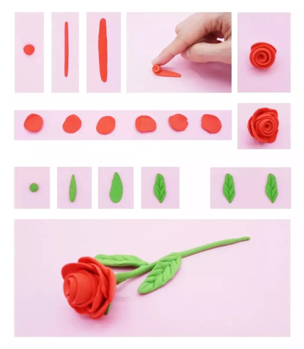 玫瑰花:玫瑰花其实很简单,搓一个长条,压扁,然后卷卷卷就可以了!如果想让玫瑰花开的大一点,可以在外围加一些小花瓣。