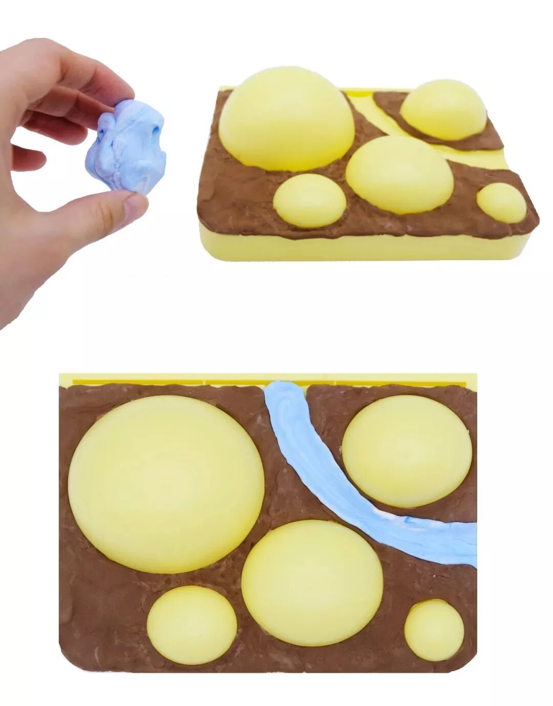 将浅蓝色粘土和白色粘土在一起调和,但不要调均匀,做出水流的感觉,填在小凹槽处,做成小溪。