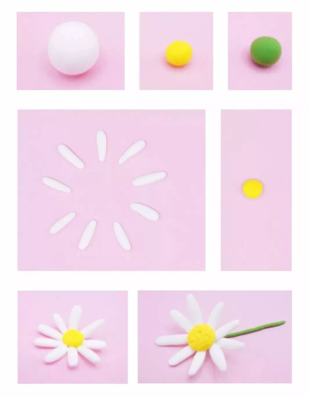 小雏菊:雏菊有很多种颜色,可以选择自己喜欢的颜色来做。柠檬老师这里选择了白色的花瓣和黄色的花蕊。做法如图,是不是超级简单?