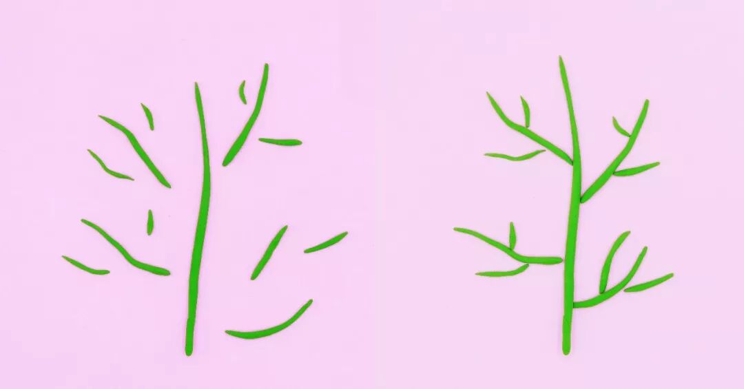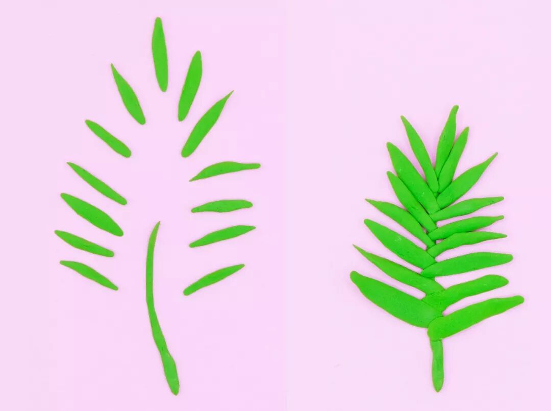 有没有发现,这其实是叶子二的升级版!搓一条长的和N条短的粘土条,将短粘土交错贴在长粘土上,这里用白胶粘会牢固些哦!