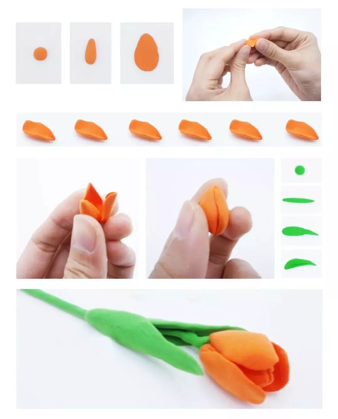 郁金香:把水滴形的粘土压扁,用四根手指掬一下,就是郁金香的花瓣了。这样的花瓣做六个,先三个裹在一起做成一个花苞,再在外围粘另外三瓣。郁金香的叶子比较长,而且是包着花茎的。