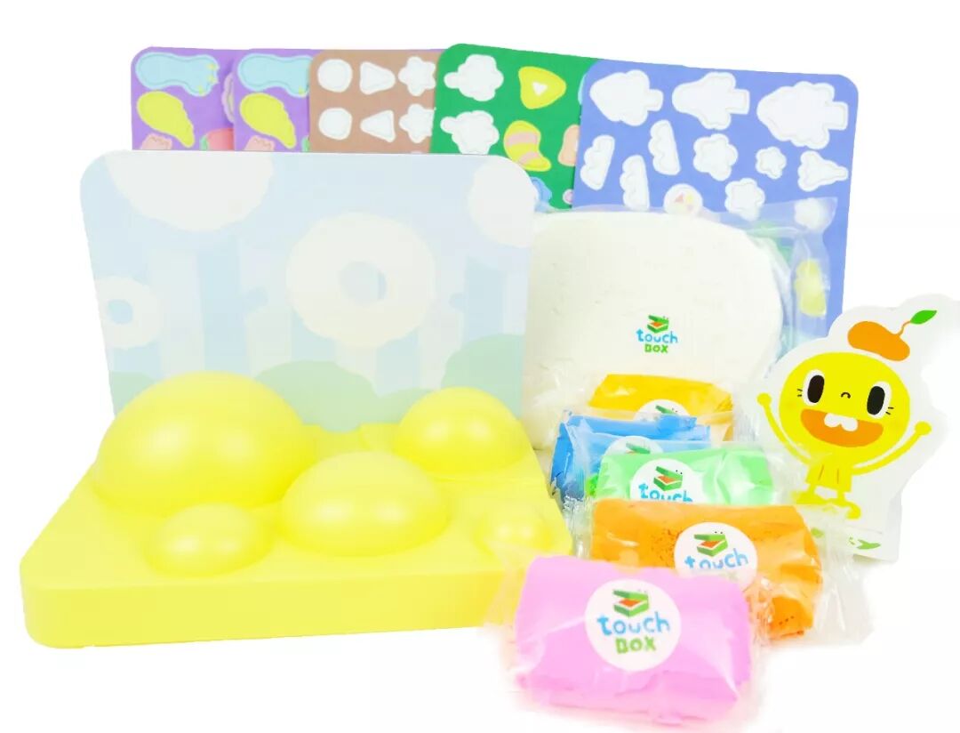 小莉老师用的是粘土教具盒,盒子里有塑料板、背景板卡纸、小怪物卡纸、奶油色和糖果色的粘土,还有我们可爱的Arkky!