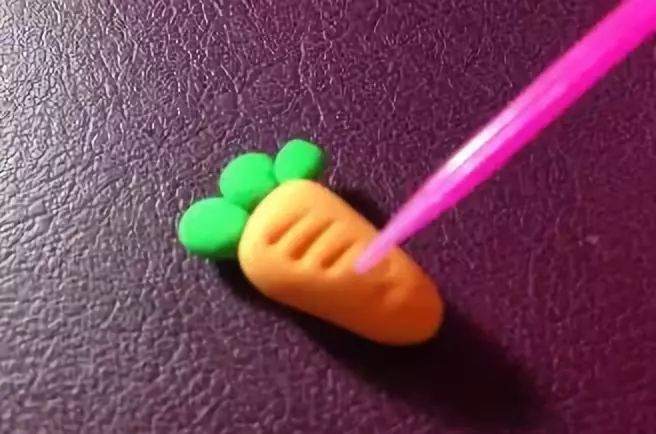 用黄色粘土和绿色粘土给小兔子做一个胡萝卜,用黄色粘土捏出一个三角形好,用绿色粘土捏出三个小圆形做叶子,然后粘在一起,用辅助工具压出胡萝卜的痕,如图;