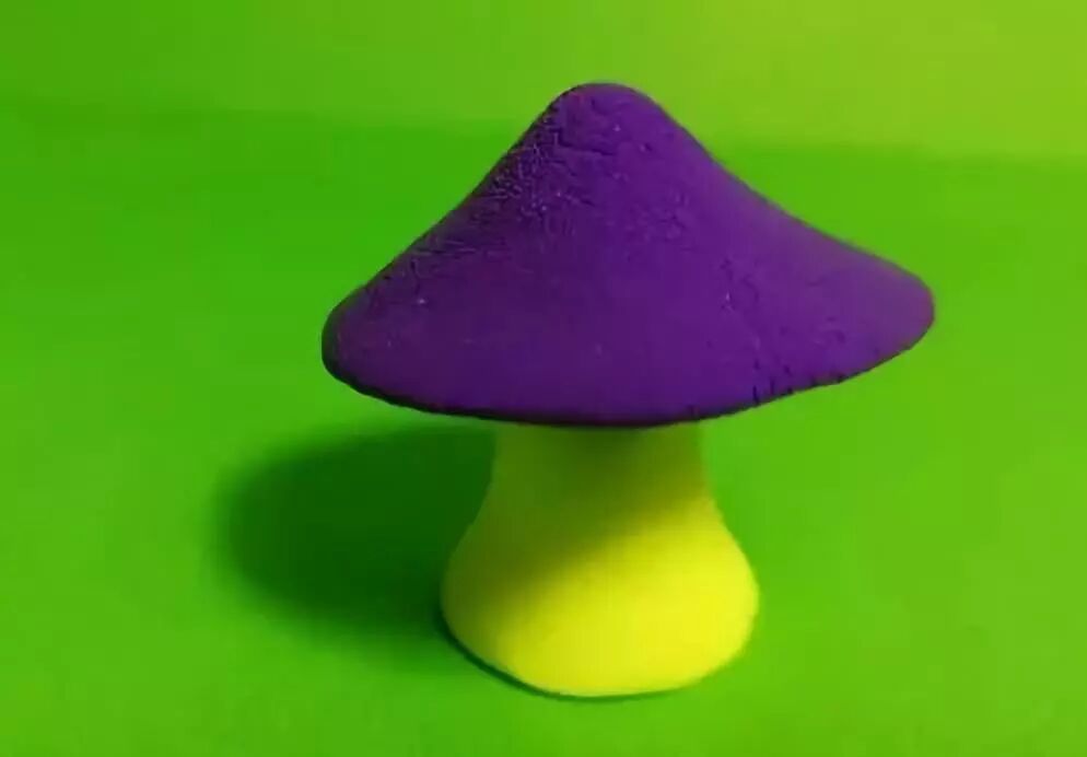 用黄色捏出一个圆柱形,然后将紫色的圆锥和黄色的圆柱粘在一起,蘑菇的外形基本就形成了;