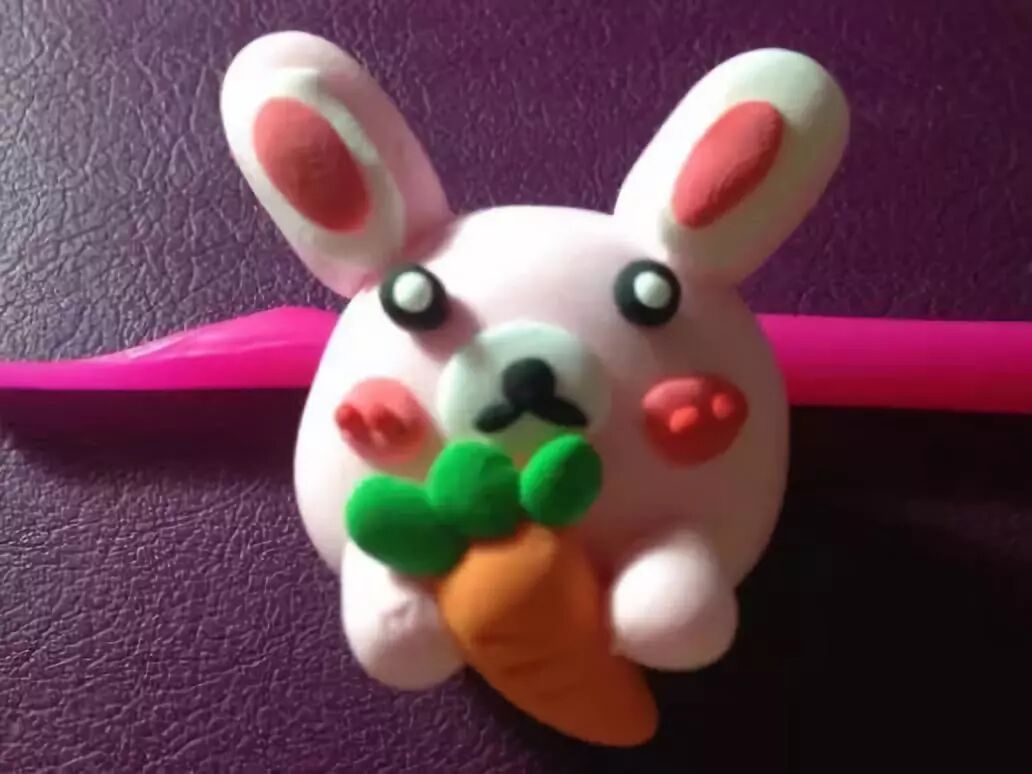 给小兔子捏出一双手,这样就可以抱着胡萝卜了,这样黏土小兔子就完成,是不是很萌呢~