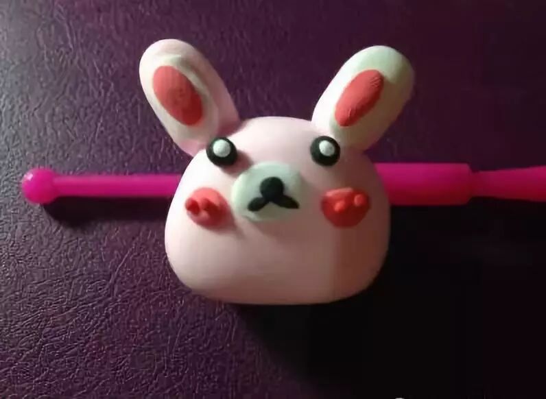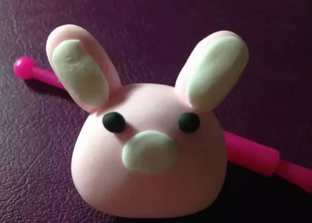 用深粉色的粘土给兔子做一下装饰,可以在脸上粘上两个腮红,在耳朵上也弄上一点深粉色;