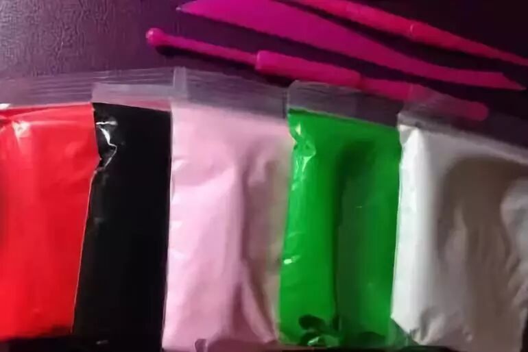 准备材料:塑料刀、塑料牙签、粉色粘土、黑色粘土、白色粘土、绿色粘土、深粉色粘土、黄色粘土