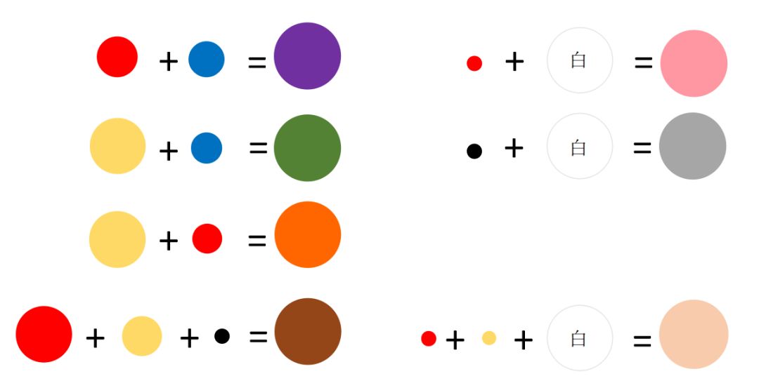 想要自己变出更多色彩?只需备好红、黄、蓝、黑、白五种颜色的粘土,按照下图所示配方,就可以调出你想要的颜色啦!