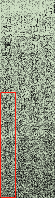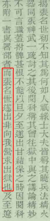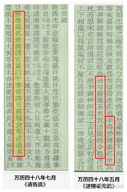 丙寅刑部尚书黄克缵参罪将张名世负三死罪营求出狱求立功自赎今无半箭之功徒云能造火药复官参将何以示劝惩而明国法乎夫援辽有废将有罪将有死罪将必分为三等以斩获之多少为复官之难易如一年内无擒斩二十人以上有废将不得复职无三十以上者罪将不许复职无百人以上者死罪将不许复职若一年以外全无斩获者差官拏回仍旧监禁庶几人心知警敌忾可振国耻可雪得旨罪弁张名世查无斩获功级不准复职余如议行[20]