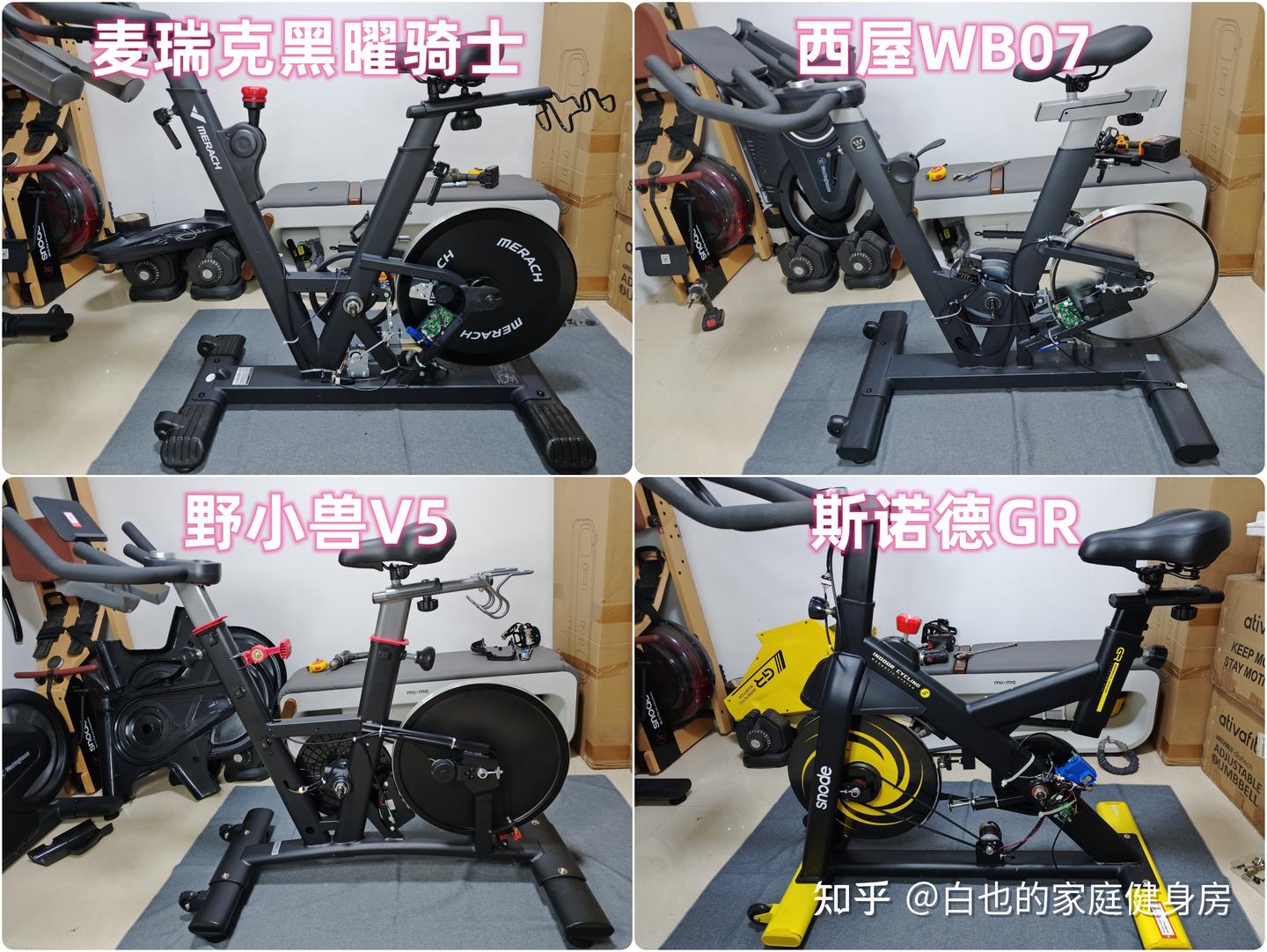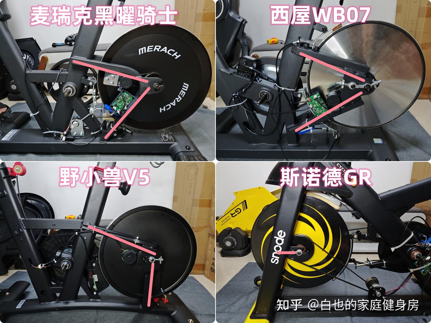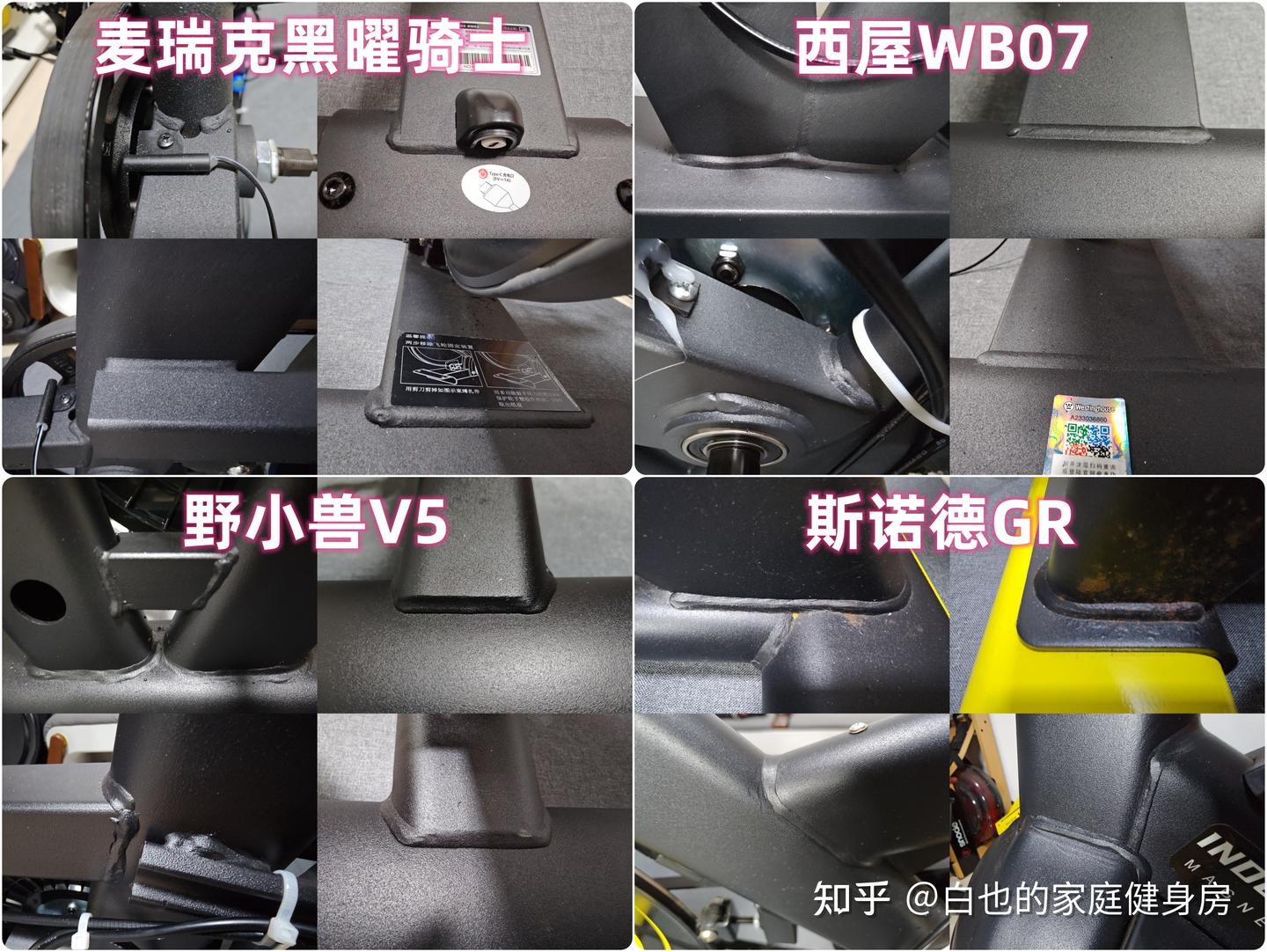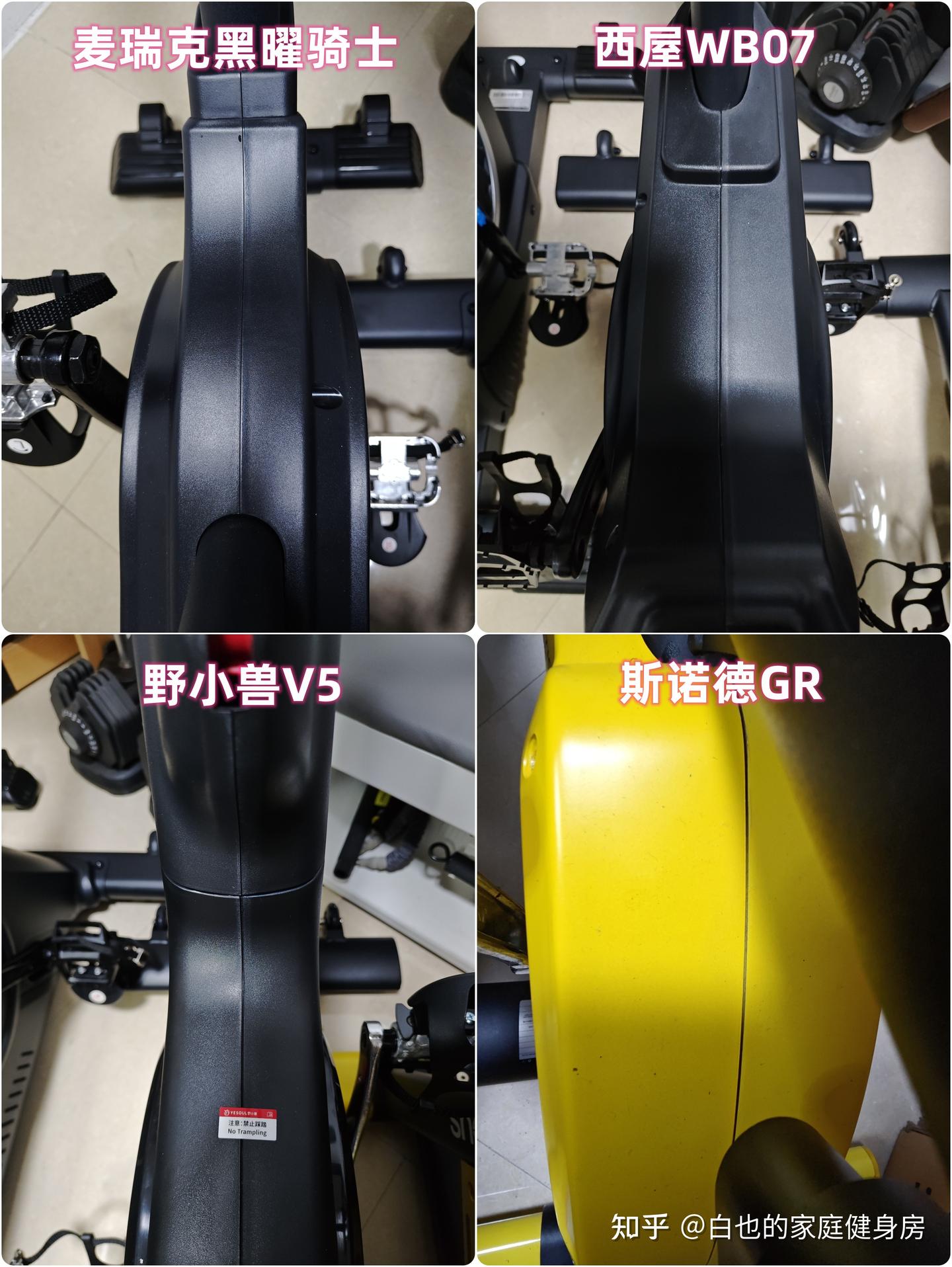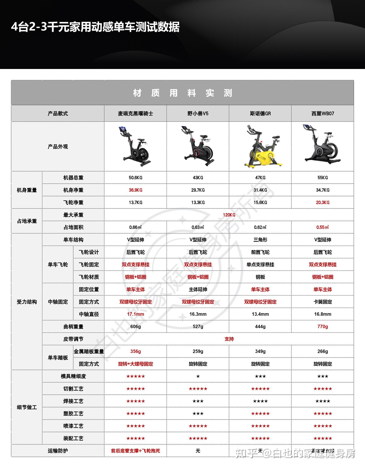 你好,我是白也,一个健身8年的老炮儿。 时隔4个月、我又来了------ 上次写的首篇全方位拆机实测一经发布广受认可,帮很多知友解决了入门级单车的选购问题,也收到不少好评,白也在此感谢诸位厚爱。 今天带来的是家用性价比动感单车全方位拆机实测,这次我会完善拆机、精简内容,帮你们提升阅读体验的同时、尽量节省阅读时间。 如果你也苦于家用动感单车选购困难却不知从何下手的话,不妨静下心来看看这篇文章,我会用10分钟告诉你动感单车的作用、选购方法、以及4款2-3千元热销款式的硬核拆机实测,帮你彻头彻尾的解决所有选购问题。 「法不轻传,道不贱卖」 本文为2-3千元价位家用动感单车实测篇,适用人群极其广泛,减脂塑形、强身健体、心肺提升皆不在话下,刷到我这篇文章的朋友们一定要仔细做功课了,哪怕我有心分享,也要你有心记住才行~ OK,正文开始—— 这3个板块白也在上一篇实测中都有非常细致的科普,为了不影响诸位的阅读体验,我就不再赘述了,感兴趣的知友可跳转传送门: 这是全文评测4款动感单车后做的相关汇总表格,你们可以参考收藏一下。 买动感单车选好品牌很重要,能确保产品的质量和安全性,技术创新、用户体验、专业程度及售后服务也不是一般小品牌可以媲美的。 ??遗憾的是绝大多数人都忽略了这个至关重要的点,只会遵从真假未知的口碑信誉而盲目跟风,白也由衷希望你们不是其中之一。 以下是4款单车的品牌背景: 创立于2018年,现在是国内专注于家庭健身科技的行业领军品牌,也是专注且深耕于极速燃脂的家庭健身全品类第一品牌,同时还是“国家高新技术企业”,目前融资估值10亿+,年研发费用投入6000万+,年获专利100+,产品不仅国内销量第一,也热销于全球超30个国家(通过美国&欧盟严苛品质认证)。 仔细观察你会发现麦瑞克的飞速发展有2个转折点: 说实话,这几年的健身器材评测中,我是看着麦瑞克一步步发展的,从最开始的筋膜枪,到后来的全系列健身器材研发,再到软硬件联动智能健身,无论是锻炼效果还是运动体验都无可挑剔。 也难怪麦瑞克那么受消费者欢迎,做到连续3年动感单车销量第一,原因无它,是真的好用。 创立于2015年,算是国内最早布局的互联网家庭品牌之一,无奈做的是入门级别单车,销量高却利润低,发展这么多年一直不温不火,直到21年小米领投后,才真正实现了智能健身,也正式成为小米旗下生态链企业。 早期野小兽能火爆出圈的原因,除了顺势乘风起,营销上和使用体验也有很大原因,营销且不说,我们来聊聊它的软件: APP里单车课程内容丰富,精细度也比较高,除了直播和往期课程、还开发了8大体系的动感单车课程和碎片化时间训练课程,为的就是满足不同人群使用需求。 那效果好吗?当然好,不过是早期而已。 随着后期Keep、麦瑞克的强势崛起,野小兽丢掉了很多市场份额,那段时间它让人吐槽最多的就是不支持智能健身。 野小兽现在的课程加上智能健身,其实在使用体验方面和麦瑞克等品牌已经区别不大了,就看哪家做的更好,在此我且留个悬念先,想了解请继续看下面实测。 斯诺德是2008年创立的,不过2014年才正式进军健身器材行业,它算是目前比较良心的国货品牌了,主打性价比。 专注于健身器材的研发,设计、销售都是独立完成的,所以东西非常不错,不仅仅是质量好、口碑、售后也相当不错,国内销量算是中上、国外也不差。 如果你不会选健身器材的话,斯诺德倒不失为一个好的考虑,比如划船机、椭圆机、动感单车这些。 无奈的是大环境越发艰难,斯诺德也全线缩减了产品线来熬过这个寒冬,椭圆机、划船机、跑步机等品类都基本下架了,只剩下几款单车在售,无奈亦无解。 西屋全称西屋电气公司,是个美国的百年品牌,主营的是家用电器和清洁能源以及工业电器,2015年才进入国内市场,发展至今,西屋涉猎领域极其广泛,专业度和品牌影响力都相当之大。 类似划船机、动感单车这种健身器材在西屋的理解中也属于家用电器,所以它就横插一脚立足其中,别说还卖的蛮好,属实奇了怪哉。 归其根本,我认为主要原因是大品牌、价格实在,单车的用料、体验、APP联动上都还OK,虽谈不上惊艳、也算中规中矩,反正让你挑不出啥毛病。 本段总结:就现状来看,4个品牌都没问题,你们可以根据自身喜好放心选。 动感单车在使用过程中得承受我们体重和动态压力,因此质量是选购要点,这方面主要看机身的用料做工,还有主体结构、连接加固、焊接方式等方面,以下是详细拆测------ 2-1-1耐用性上看 ??这是单车稳固耐用的第一个方面 由于成本充足,这次评测款式外壳皆是塑料包裹,结构则为纯钢机身,质地轻便、密度均匀、抗拉强度高,会比铸铁机身耐用很多、堪称目前的单车框架首选材料,这也是性价比单车和入门级的明显差异之一。 在质量上我们首先看整机重量,另外,为了更加公平公正,我会将单车配重的飞轮去掉来计算,以下是4款实测机身重量: 小结:单从机身用料上来看,麦瑞克夺魁,其次是西屋,再到斯诺德,野小兽机身重量是最轻的,体重比较大的人群可以优先考虑前两款。 2-1-2稳固性上看 相比千元款式,2-3千元单车的材质用料好太多了,骑行过程中基本不会出现机身不稳的情况,这种轻商用款式除了花式踩随你折腾,在稳固性能上还是蛮优秀的。 以下是千元款式,你可以看出明显差距: 2-3千元单车