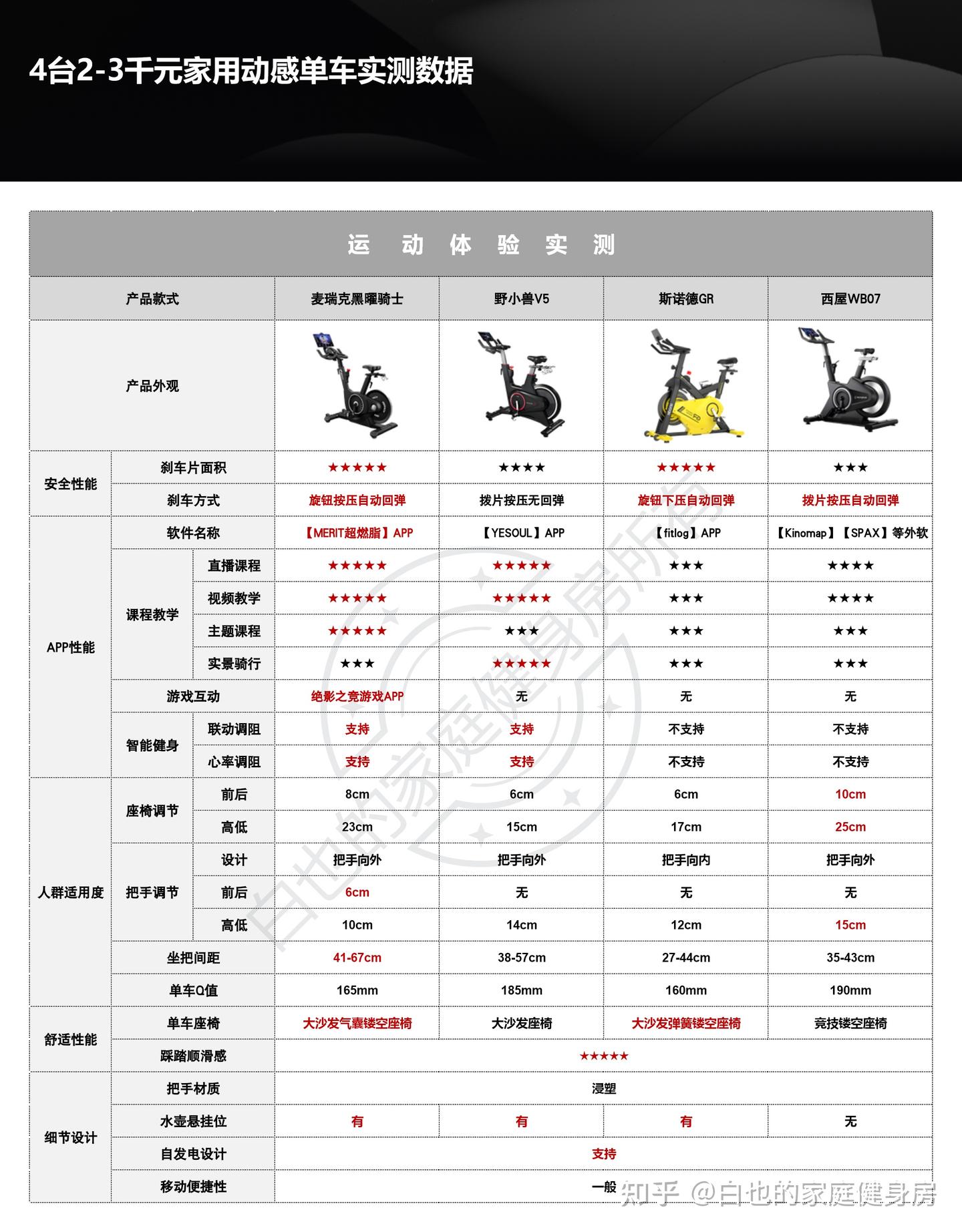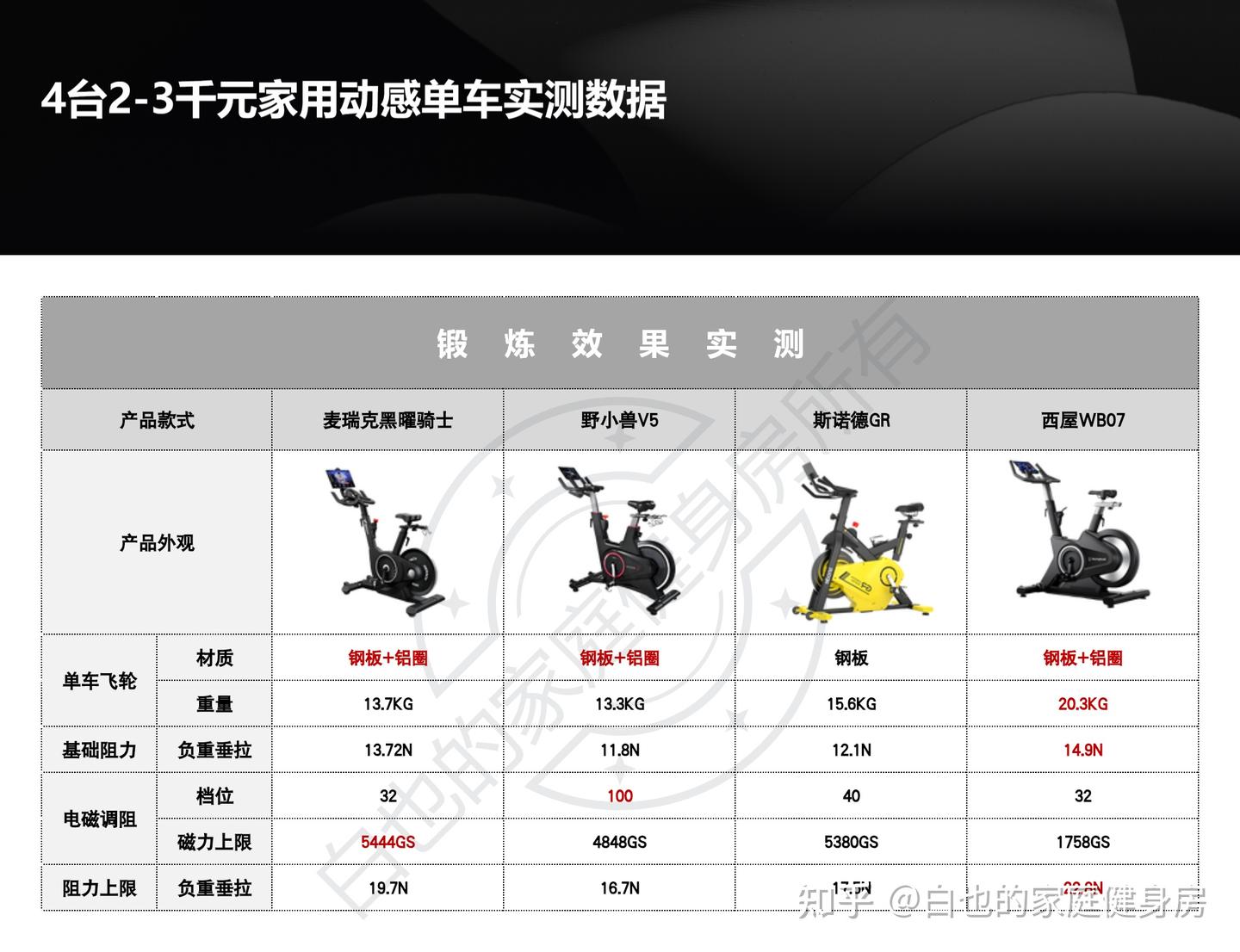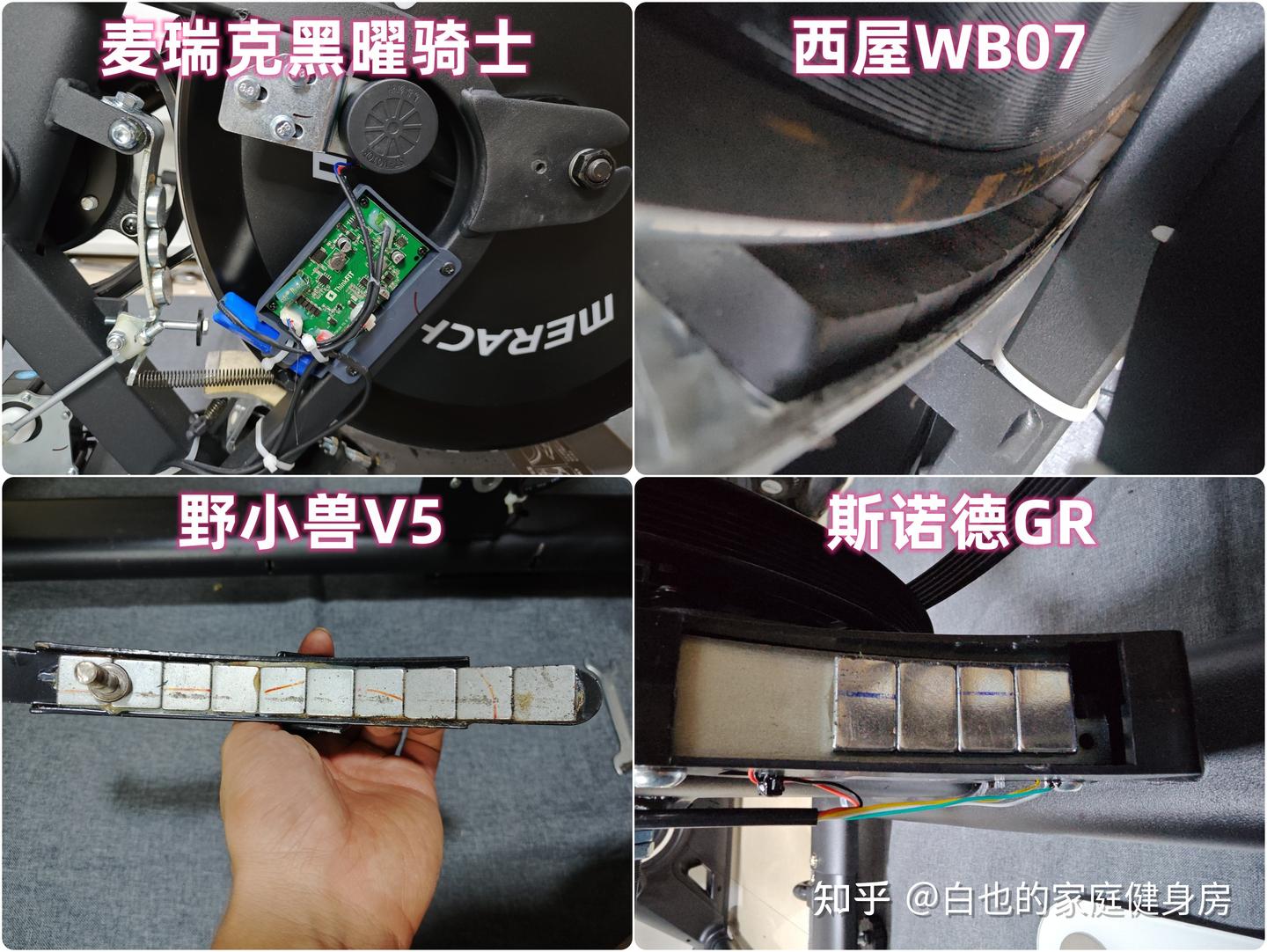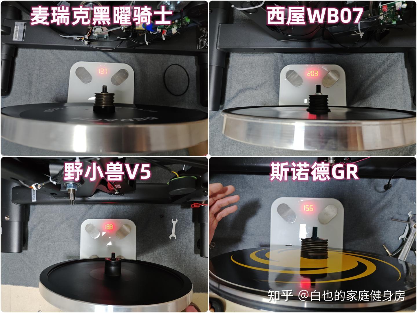 你好,我是白也,一个健身8年的老炮儿。 时隔4个月、我又来了------ 上次写的首篇全方位拆机实测一经发布广受认可,帮很多知友解决了入门级单车的选购问题,也收到不少好评,白也在此感谢诸位厚爱。 今天带来的是家用性价比动感单车全方位拆机实测,这次我会完善拆机、精简内容,帮你们提升阅读体验的同时、尽量节省阅读时间。 如果你也苦于家用动感单车选购困难却不知从何下手的话,不妨静下心来看看这篇文章,我会用10分钟告诉你动感单车的作用、选购方法、以及4款2-3千元热销款式的硬核拆机实测,帮你彻头彻尾的解决所有选购问题。 「法不轻传,道不贱卖」 本文为2-3千元价位家用动感单车实测篇,适用人群极其广泛,减脂塑形、强身健体、心肺提升皆不在话下,刷到我这篇文章的朋友们一定要仔细做功课了,哪怕我有心分享,也要你有心记住才行~ OK,正文开始—— 这3个板块白也在上一篇实测中都有非常细致的科普,为了不影响诸位的阅读体验,我就不再赘述了,感兴趣的知友可跳转传送门: 这是全文评测4款动感单车后做的相关汇总表格,你们可以参考收藏一下。 买动感单车选好品牌很重要,能确保产品的质量和安全性,技术创新、用户体验、专业程度及售后服务也不是一般小品牌可以媲美的。 ??遗憾的是绝大多数人都忽略了这个至关重要的点,只会遵从真假未知的口碑信誉而盲目跟风,白也由衷希望你们不是其中之一。 以下是4款单车的品牌背景: 创立于2018年,现在是国内专注于家庭健身科技的行业领军品牌,也是专注且深耕于极速燃脂的家庭健身全品类第一品牌,同时还是“国家高新技术企业”,目前融资估值10亿+,年研发费用投入6000万+,年获专利100+,产品不仅国内销量第一,也热销于全球超30个国家(通过美国&欧盟严苛品质认证)。 仔细观察你会发现麦瑞克的飞速发展有2个转折点: 说实话,这几年的健身器材评测中,我是看着麦瑞克一步步发展的,从最开始的筋膜枪,到后来的全系列健身器材研发,再到软硬件联动智能健身,无论是锻炼效果还是运动体验都无可挑剔。 也难怪麦瑞克那么受消费者欢迎,做到连续3年动感单车销量第一,原因无它,是真的好用。 创立于2015年,算是国内最早布局的互联网家庭品牌之一,无奈做的是入门级别单车,销量高却利润低,发展这么多年一直不温不火,直到21年小米领投后,才真正实现了智能健身,也正式成为小米旗下生态链企业。 早期野小兽能火爆出圈的原因,除了顺势乘风起,营销上和使用体验也有很大原因,营销且不说,我们来聊聊它的软件: APP里单车课程内容丰富,精细度也比较高,除了直播和往期课程、还开发了8大体系的动感单车课程和碎片化时间训练课程,为的就是满足不同人群使用需求。 那效果好吗?当然好,不过是早期而已。 随着后期Keep、麦瑞克的强势崛起,野小兽丢掉了很多市场份额,那段时间它让人吐槽最多的就是不支持智能健身。 野小兽现在的课程加上智能健身,其实在使用体验方面和麦瑞克等品牌已经区别不大了,就看哪家做的更好,在此我且留个悬念先,想了解请继续看下面实测。 斯诺德是2008年创立的,不过2014年才正式进军健身器材行业,它算是目前比较良心的国货品牌了,主打性价比。 专注于健身器材的研发,设计、销售都是独立完成的,所以东西非常不错,不仅仅是质量好、口碑、售后也相当不错,国内销量算是中上、国外也不差。 如果你不会选健身器材的话,斯诺德倒不失为一个好的考虑,比如划船机、椭圆机、动感单车这些。 无奈的是大环境越发艰难,斯诺德也全线缩减了产品线来熬过这个寒冬,椭圆机、划船机、跑步机等品类都基本下架了,只剩下几款单车在售,无奈亦无解。 西屋全称西屋电气公司,是个美国的百年品牌,主营的是家用电器和清洁能源以及工业电器,2015年才进入国内市场,发展至今,西屋涉猎领域极其广泛,专业度和品牌影响力都相当之大。 类似划船机、动感单车这种健身器材在西屋的理解中也属于家用电器,所以它就横插一脚立足其中,别说还卖的蛮好,属实奇了怪哉。 归其根本,我认为主要原因是大品牌、价格实在,单车的用料、体验、APP联动上都还OK,虽谈不上惊艳、也算中规中矩,反正让你挑不出啥毛病。 本段总结:就现状来看,4个品牌都没问题,你们可以根据自身喜好放心选。 动感单车在使用过程中得承受我们体重和动态压力,因此质量是选购要点,这方面主要看机身的用料做工,还有主体结构、连接加固、焊接方式等方面,以下是详细拆测------ 2-1-1耐用性上看 ??这是单车稳固耐用的第一个方面 由于成本充足,这次评测款式外壳皆是塑料包裹,结构则为纯钢机身,质地轻便、密度均匀、抗拉强度高,会比铸铁机身耐用很多、堪称目前的单车框架首选材料,这也是性价比单车和入门级的明显差异之一。 在质量上我们首先看整机重量,另外,为了更加公平公正,我会将单车配重的飞轮去掉来计算,以下是4款实测机身重量: 小结:单从机身用料上来看,麦瑞克夺魁,其次是西屋,再到斯诺德,野小兽机身重量是最轻的,体重比较大的人群可以优先考虑前两款。 2-1-2稳固性上看 相比千元款式,2-3千元单车的材质用料好太多了,骑行过程中基本不会出现机身不稳的情况,这种轻商用款式除了花式踩随你折腾,在稳固性能上还是蛮优秀的。 以下是千元款式,你可以看出明显差距: 2-3千元单车