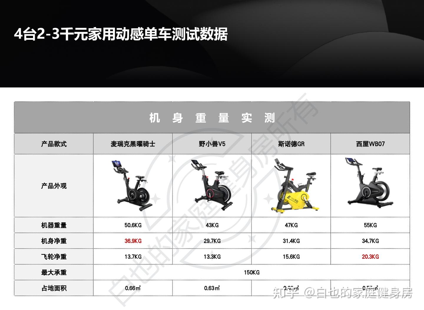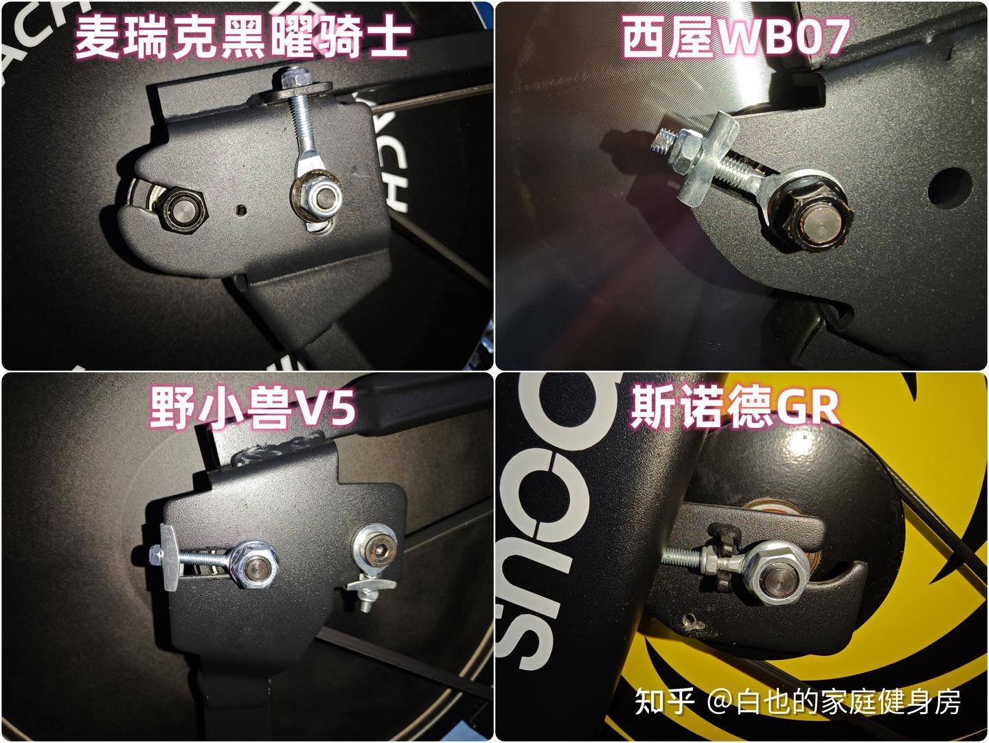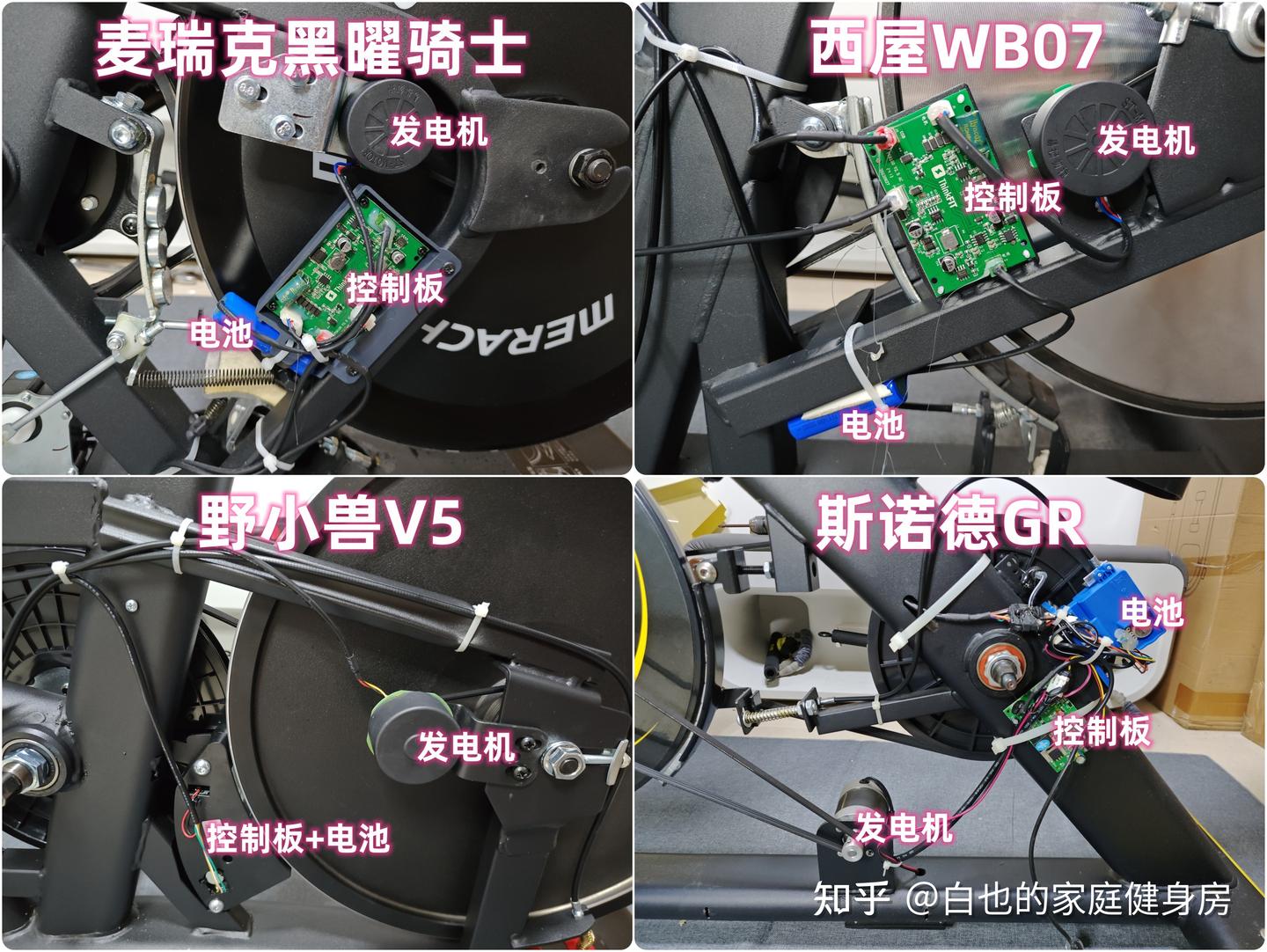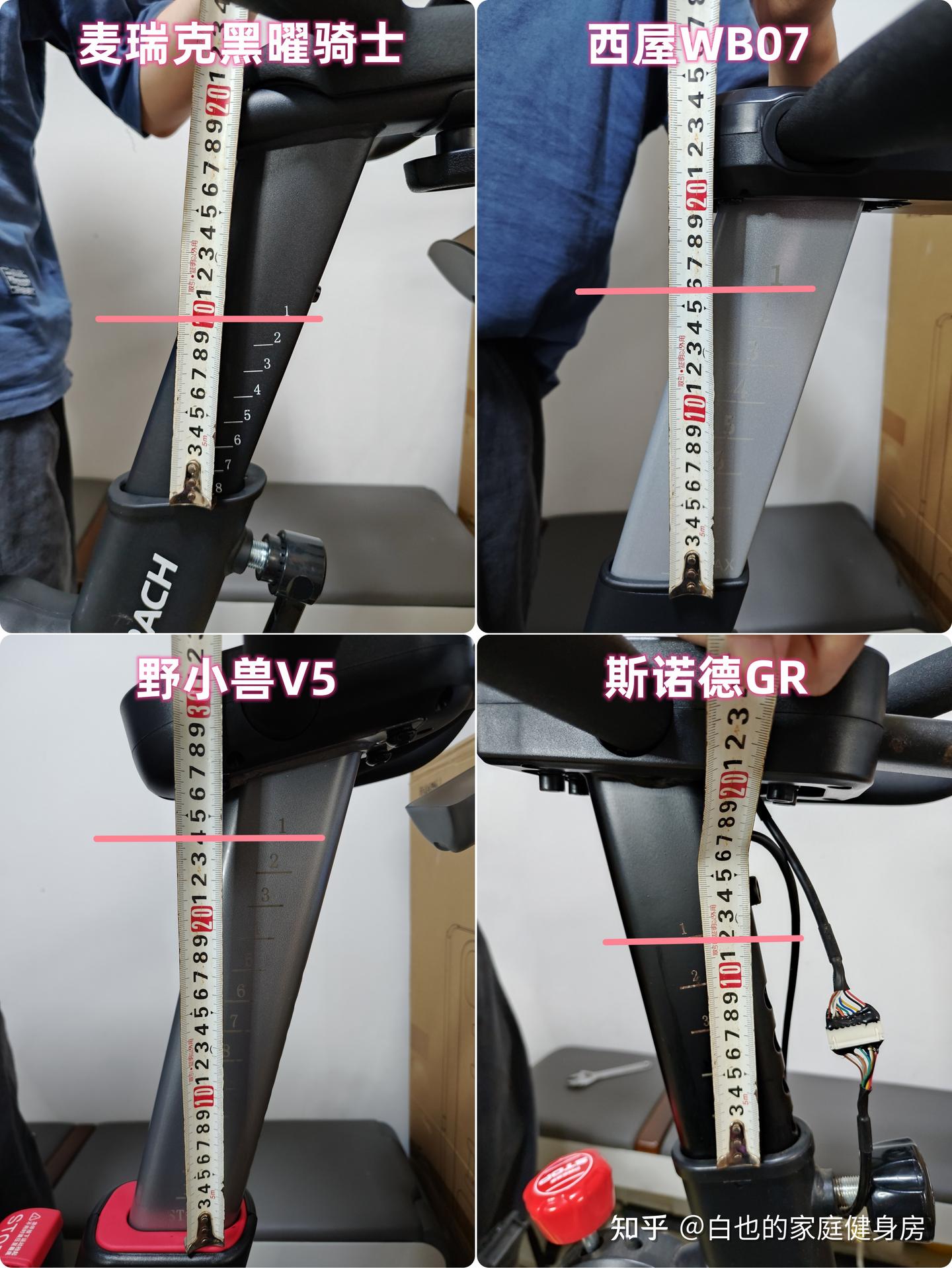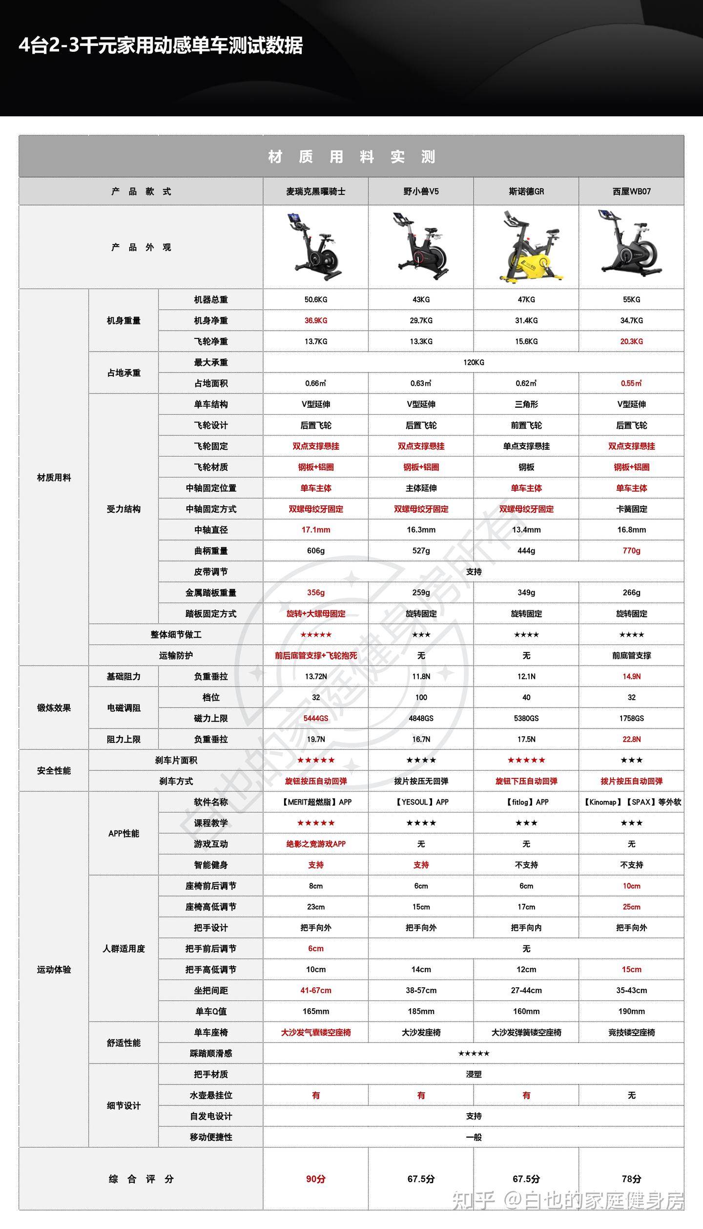 你好,我是白也,一个健身8年的老炮儿。 时隔4个月、我又来了------ 上次写的首篇全方位拆机实测一经发布广受认可,帮很多知友解决了入门级单车的选购问题,也收到不少好评,白也在此感谢诸位厚爱。 今天带来的是家用性价比动感单车全方位拆机实测,这次我会完善拆机、精简内容,帮你们提升阅读体验的同时、尽量节省阅读时间。 如果你也苦于家用动感单车选购困难却不知从何下手的话,不妨静下心来看看这篇文章,我会用10分钟告诉你动感单车的作用、选购方法、以及4款2-3千元热销款式的硬核拆机实测,帮你彻头彻尾的解决所有选购问题。 「法不轻传,道不贱卖」 本文为2-3千元价位家用动感单车实测篇,适用人群极其广泛,减脂塑形、强身健体、心肺提升皆不在话下,刷到我这篇文章的朋友们一定要仔细做功课了,哪怕我有心分享,也要你有心记住才行~ OK,正文开始—— 这3个板块白也在上一篇实测中都有非常细致的科普,为了不影响诸位的阅读体验,我就不再赘述了,感兴趣的知友可跳转传送门: 这是全文评测4款动感单车后做的相关汇总表格,你们可以参考收藏一下。 买动感单车选好品牌很重要,能确保产品的质量和安全性,技术创新、用户体验、专业程度及售后服务也不是一般小品牌可以媲美的。 ??遗憾的是绝大多数人都忽略了这个至关重要的点,只会遵从真假未知的口碑信誉而盲目跟风,白也由衷希望你们不是其中之一。 以下是4款单车的品牌背景: 创立于2018年,现在是国内专注于家庭健身科技的行业领军品牌,也是专注且深耕于极速燃脂的家庭健身全品类第一品牌,同时还是“国家高新技术企业”,目前融资估值10亿+,年研发费用投入6000万+,年获专利100+,产品不仅国内销量第一,也热销于全球超30个国家(通过美国&欧盟严苛品质认证)。 仔细观察你会发现麦瑞克的飞速发展有2个转折点: 说实话,这几年的健身器材评测中,我是看着麦瑞克一步步发展的,从最开始的筋膜枪,到后来的全系列健身器材研发,再到软硬件联动智能健身,无论是锻炼效果还是运动体验都无可挑剔。 也难怪麦瑞克那么受消费者欢迎,做到连续3年动感单车销量第一,原因无它,是真的好用。 创立于2015年,算是国内最早布局的互联网家庭品牌之一,无奈做的是入门级别单车,销量高却利润低,发展这么多年一直不温不火,直到21年小米领投后,才真正实现了智能健身,也正式成为小米旗下生态链企业。 早期野小兽能火爆出圈的原因,除了顺势乘风起,营销上和使用体验也有很大原因,营销且不说,我们来聊聊它的软件: APP里单车课程内容丰富,精细度也比较高,除了直播和往期课程、还开发了8大体系的动感单车课程和碎片化时间训练课程,为的就是满足不同人群使用需求。 那效果好吗?当然好,不过是早期而已。 随着后期Keep、麦瑞克的强势崛起,野小兽丢掉了很多市场份额,那段时间它让人吐槽最多的就是不支持智能健身。 野小兽现在的课程加上智能健身,其实在使用体验方面和麦瑞克等品牌已经区别不大了,就看哪家做的更好,在此我且留个悬念先,想了解请继续看下面实测。 斯诺德是2008年创立的,不过2014年才正式进军健身器材行业,它算是目前比较良心的国货品牌了,主打性价比。 专注于健身器材的研发,设计、销售都是独立完成的,所以东西非常不错,不仅仅是质量好、口碑、售后也相当不错,国内销量算是中上、国外也不差。 如果你不会选健身器材的话,斯诺德倒不失为一个好的考虑,比如划船机、椭圆机、动感单车这些。 无奈的是大环境越发艰难,斯诺德也全线缩减了产品线来熬过这个寒冬,椭圆机、划船机、跑步机等品类都基本下架了,只剩下几款单车在售,无奈亦无解。 西屋全称西屋电气公司,是个美国的百年品牌,主营的是家用电器和清洁能源以及工业电器,2015年才进入国内市场,发展至今,西屋涉猎领域极其广泛,专业度和品牌影响力都相当之大。 类似划船机、动感单车这种健身器材在西屋的理解中也属于家用电器,所以它就横插一脚立足其中,别说还卖的蛮好,属实奇了怪哉。 归其根本,我认为主要原因是大品牌、价格实在,单车的用料、体验、APP联动上都还OK,虽谈不上惊艳、也算中规中矩,反正让你挑不出啥毛病。 本段总结:就现状来看,4个品牌都没问题,你们可以根据自身喜好放心选。 动感单车在使用过程中得承受我们体重和动态压力,因此质量是选购要点,这方面主要看机身的用料做工,还有主体结构、连接加固、焊接方式等方面,以下是详细拆测------ 2-1-1耐用性上看 ??这是单车稳固耐用的第一个方面 由于成本充足,这次评测款式外壳皆是塑料包裹,结构则为纯钢机身,质地轻便、密度均匀、抗拉强度高,会比铸铁机身耐用很多、堪称目前的单车框架首选材料,这也是性价比单车和入门级的明显差异之一。 在质量上我们首先看整机重量,另外,为了更加公平公正,我会将单车配重的飞轮去掉来计算,以下是4款实测机身重量: 小结:单从机身用料上来看,麦瑞克夺魁,其次是西屋,再到斯诺德,野小兽机身重量是最轻的,体重比较大的人群可以优先考虑前两款。 2-1-2稳固性上看 相比千元款式,2-3千元单车的材质用料好太多了,骑行过程中基本不会出现机身不稳的情况,这种轻商用款式除了花式踩随你折腾,在稳固性能上还是蛮优秀的。 以下是千元款式,你可以看出明显差距: 2-3千元单车