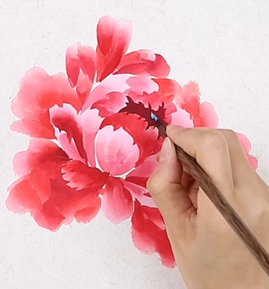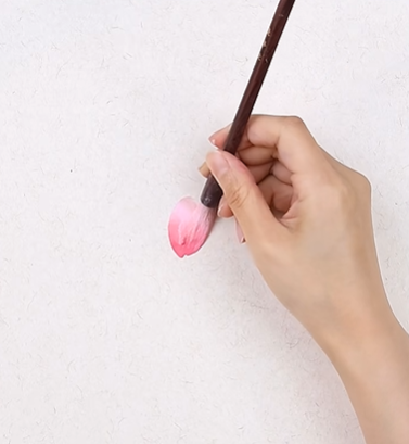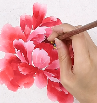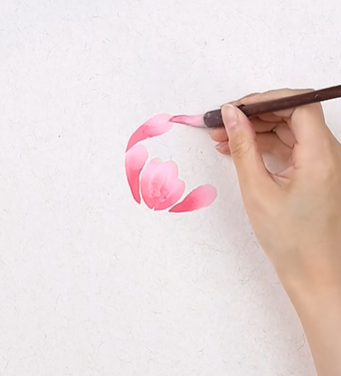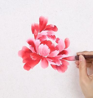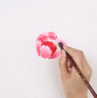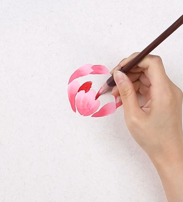 第三步:花瓣呈半圆形组合,笔尖调重曙红,画中心花瓣;