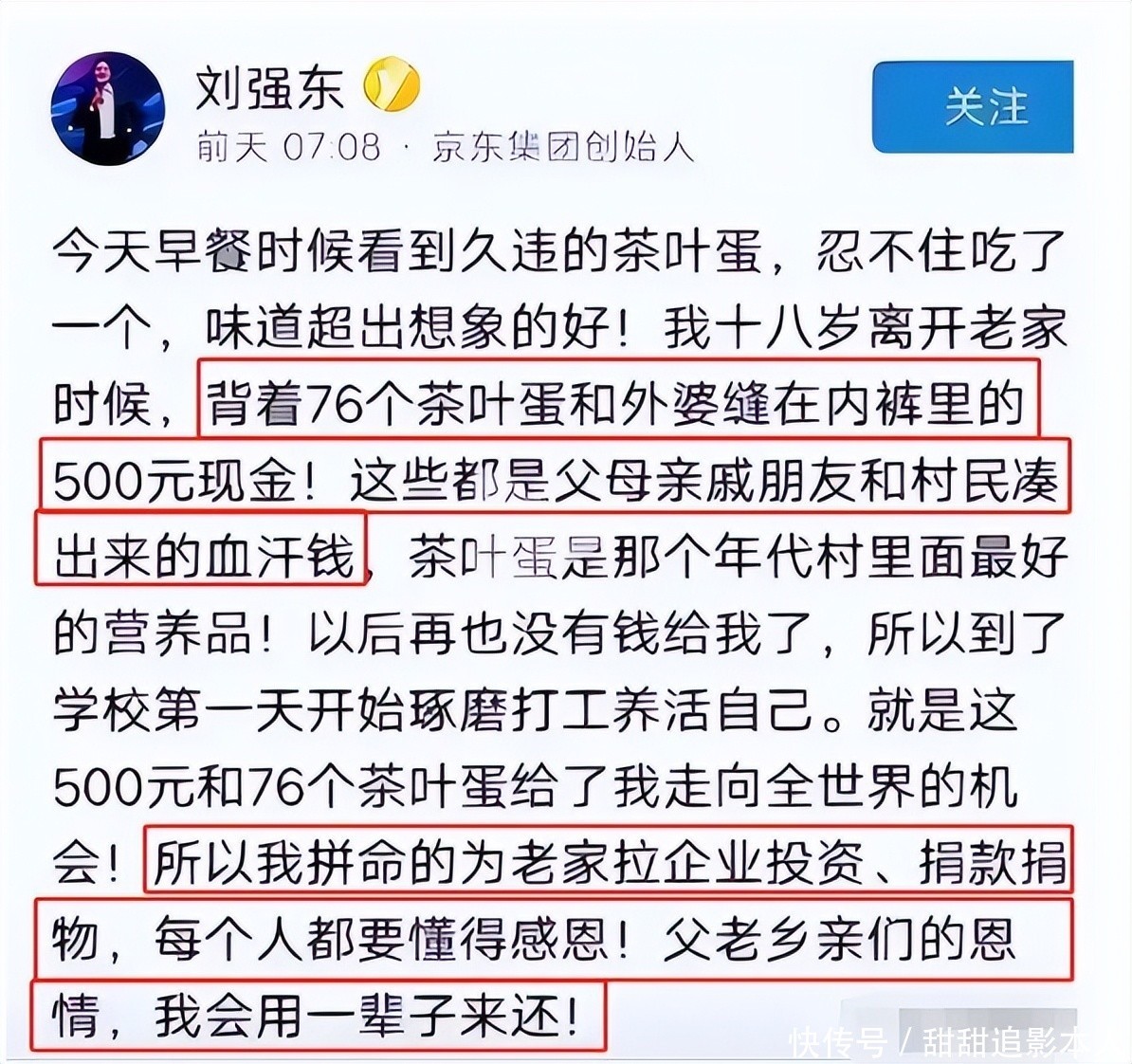 刘强东被父老乡亲们的关怀深深的感动,这份情谊一直在他心中牢牢记着。