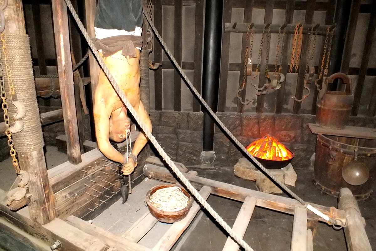 图为“二龙吐须”,这种刑法是将面条作为刑具。先让犯人饿肚子,然后命他吃两大碗指头粗细的半生不熟的面条,然后再将犯人倒挂在架子上,不一会犯人被挂的眼睛发直,百脉颠倒,刚吃的两碗面条一根根从嘴、鼻孔流出来,难受之极。