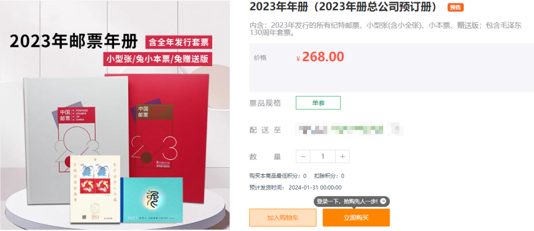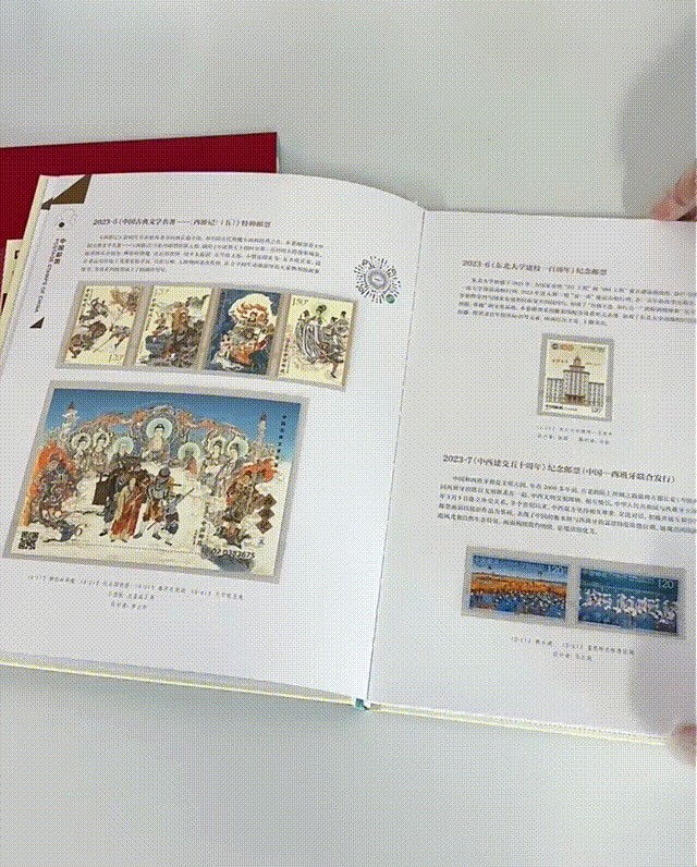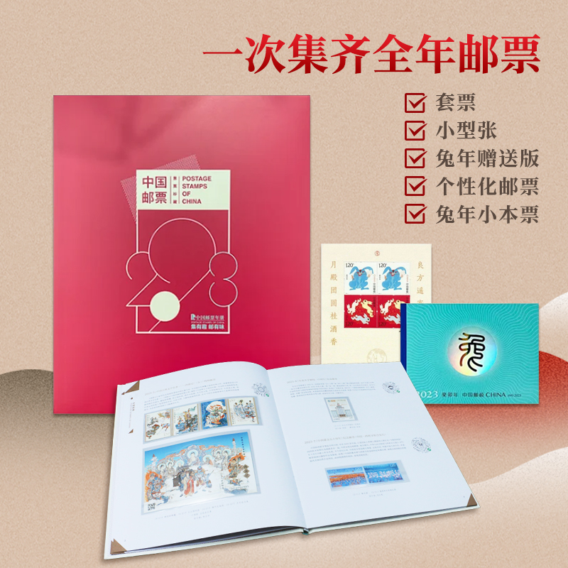 2、收藏合集 : 热门邮票一次集齐,枚枚经典,对于集邮爱好者来说就是等候已久的老朋友!3、超值赠送:收录了“纪念毛泽东同志诞辰130周年纪年套票4枚”等珍贵邮票,收藏和欣赏价值都很高,而且附赠的兔年邮票特别版,仅年册里才会有哦。4、收藏方便 : 年册采用对插封套,不容易散落。每一枚邮票都有自己的专属位置。5、自媒体特惠福利: 邮政官方发行价为268元,自媒体特惠福利仅需238元!一次集齐全年邮票,机会难得不容错过!每到年末,中国邮政旗下的中国集邮公司会发行一套邮票年册,一次性集齐当年发行过的所有邮票。这是延续了几十年的年末传统项目,每年一经推出,都会引起收藏市场的疯狂追捧!藏友们注意了,和其它商家自制的低档册不一样,我们这款官方预订册是包含生肖赠送版的!非常靠谱!个人想要凑齐全年的每一套邮票,得自己费心一枚枚去排队收集,真的很耗费时间、精力。一次性就能集齐一整年的邮票,既省去了一次次排队的麻烦,又省去了品相不好保存的烦恼,一举两得。这套邮票年册包含了2023年发行的所有纪特邮票,部分小型张、小全张!其中不乏很多珍贵的作品,堪称是集邮爱好者一生不能错过的经典!
