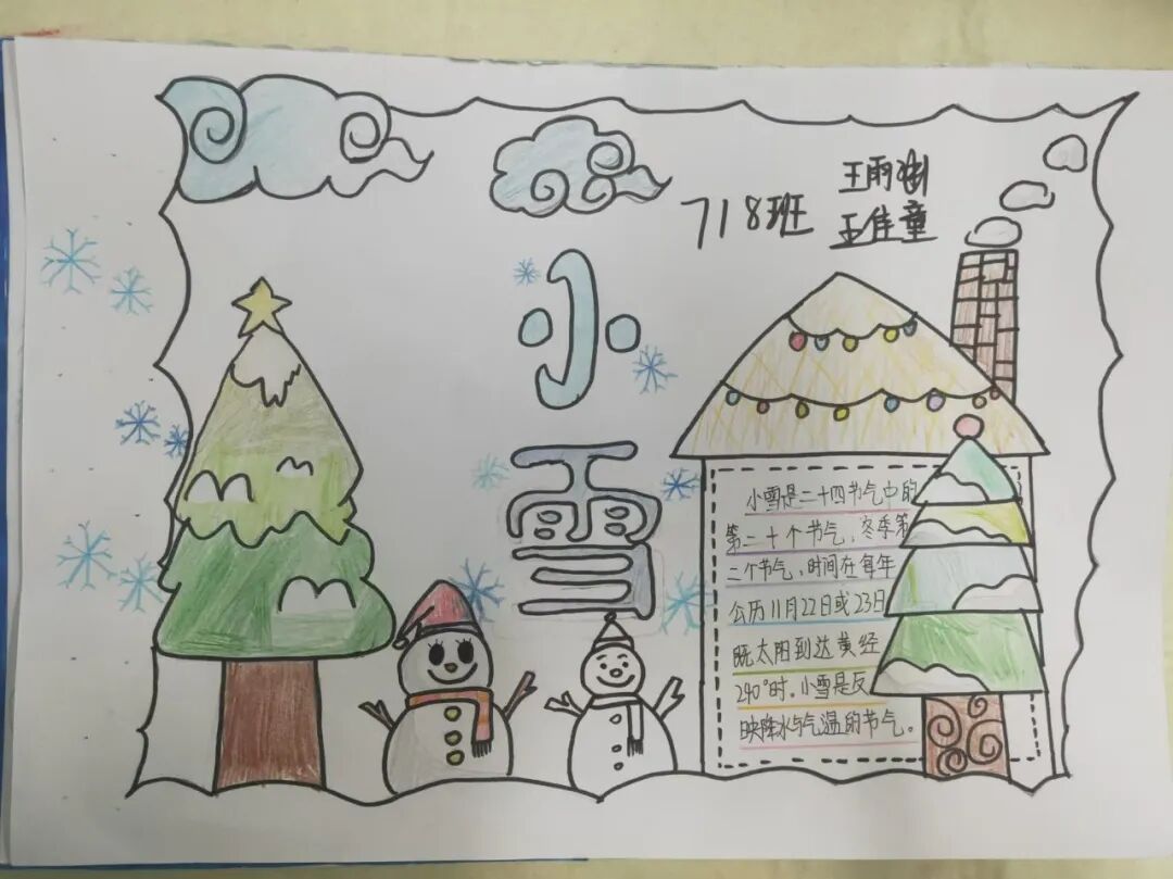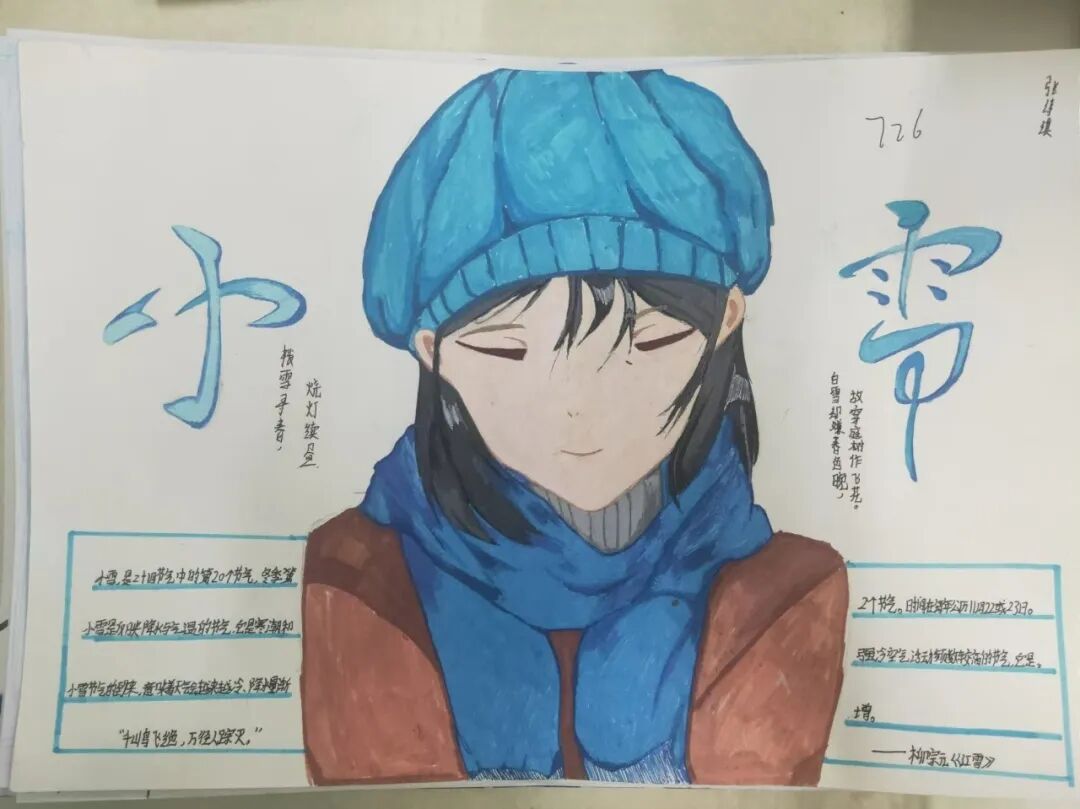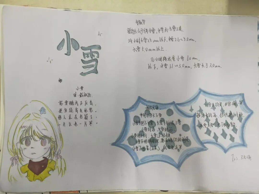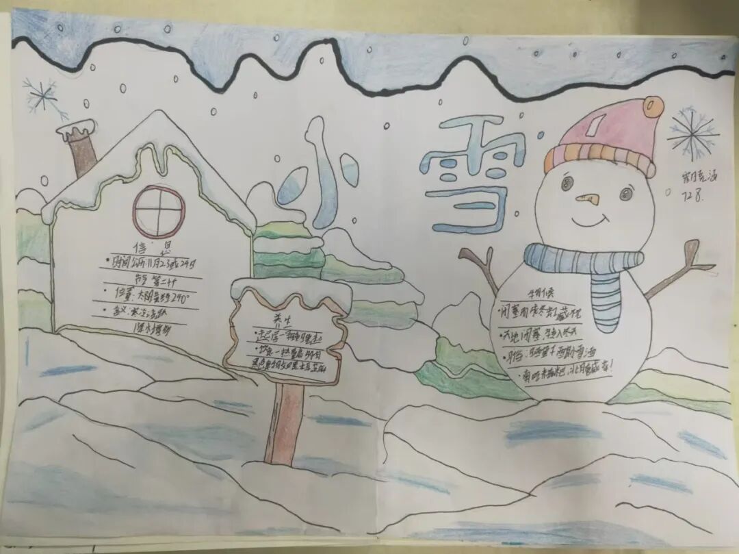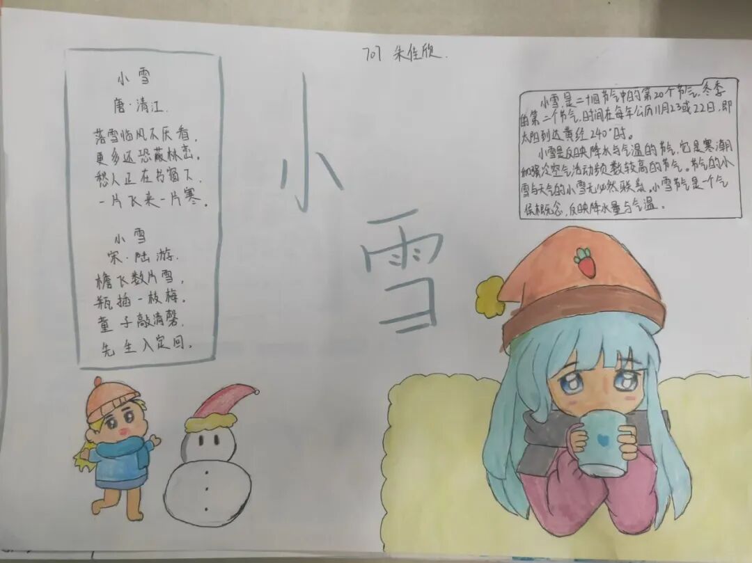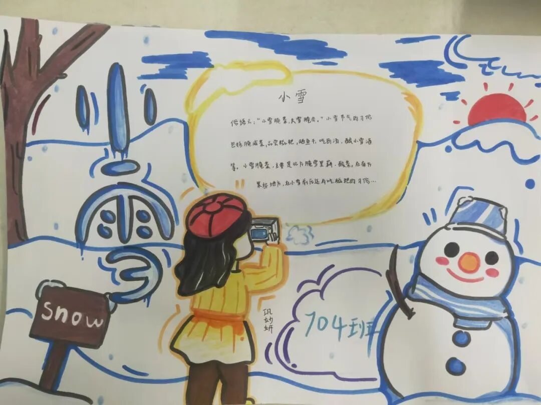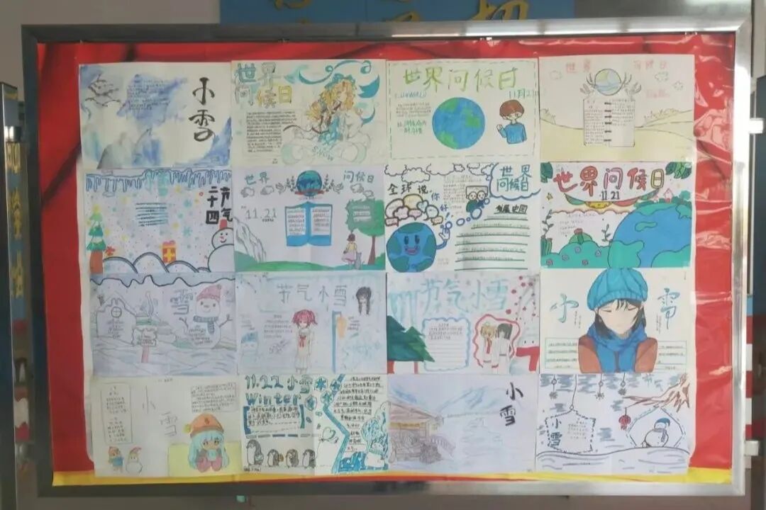 同学们热情高涨,通过查找资料,了解小雪的起源、饮食文化和本地民俗等,感受小雪节气的气候特点,搜索关于世界问候日的来历和宗旨。精心设计,巧手绘制了五彩缤纷的小雪节气或世界问候日的主题画面,以细腻的笔触描绘出暖心的问候,用优美的线条勾勒冬日的可爱。