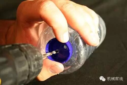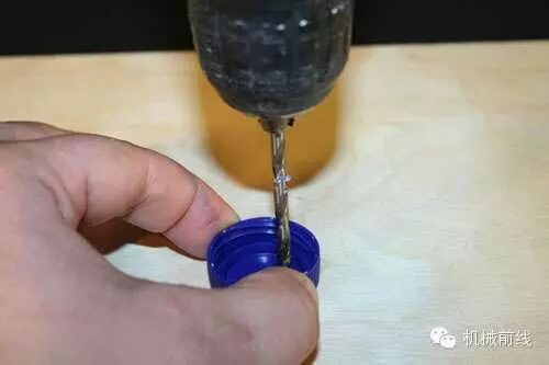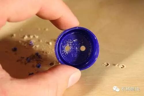 第三步:然后将第一个钻好的瓶盖倒扣在第二个瓶子的瓶盖上,透过第一个瓶盖钻好的孔去加工第二个瓶盖,这样就可以保证所有的瓶盖钻孔的位置都是一致的。使用同样的方法处理第三个瓶盖。
