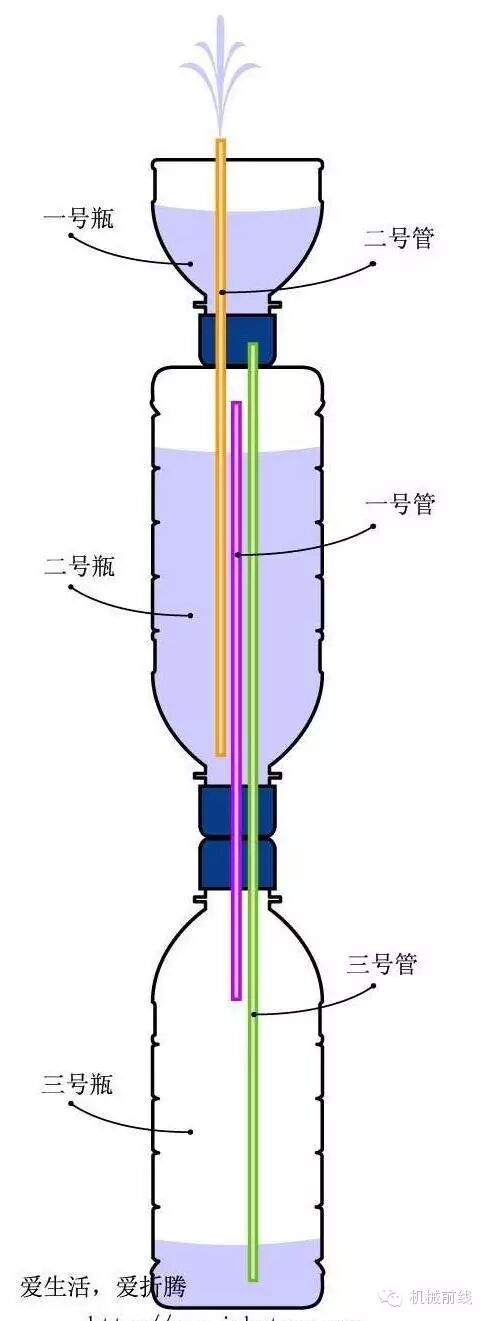 第四步:零件都加工好了,我们来装配它吧。示意图如上,相信大家都很容易看懂。 注意事项: 保证所有的接口处都要保证是密闭的; 一号管20厘米,二号馆30厘米,三号管40厘米; 使用 科技小制作喷泉胶水封闭管子与瓶盖的接口处; 请确保胶管都处在适当的高度,参考装配图。