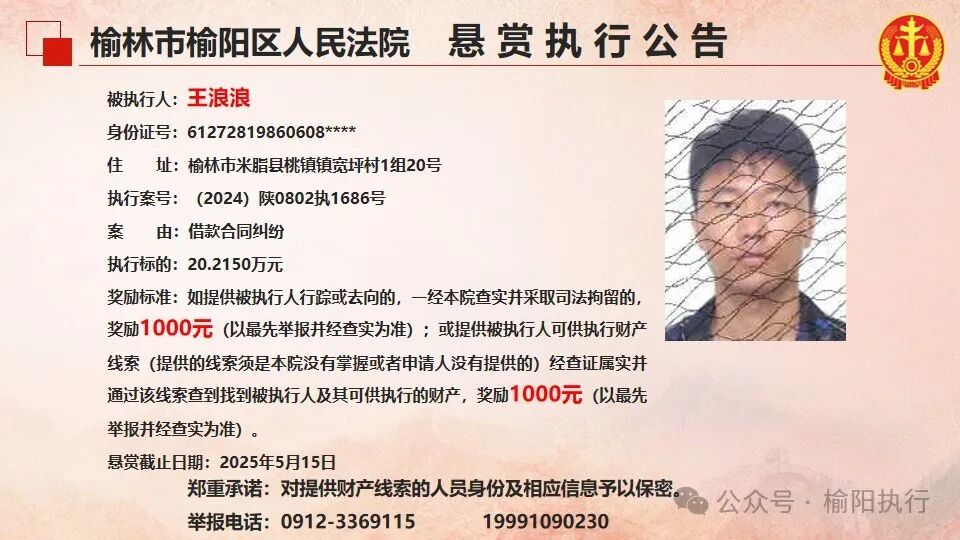 ? 本院郑重承诺:本院坚决维护举报人的利益,对提供财产线索的人员身份及提供线索的有关情况予以保密。? 悬赏金领取方式:对于符合支付悬赏金条件的举报人,本院在对被执行人下落查证属实并采取控制措施后或财产线索依法处分完毕后三十日内,从执行到位款项中优先扣取悬赏金支付给举报人。