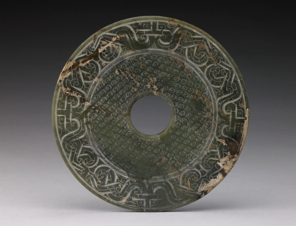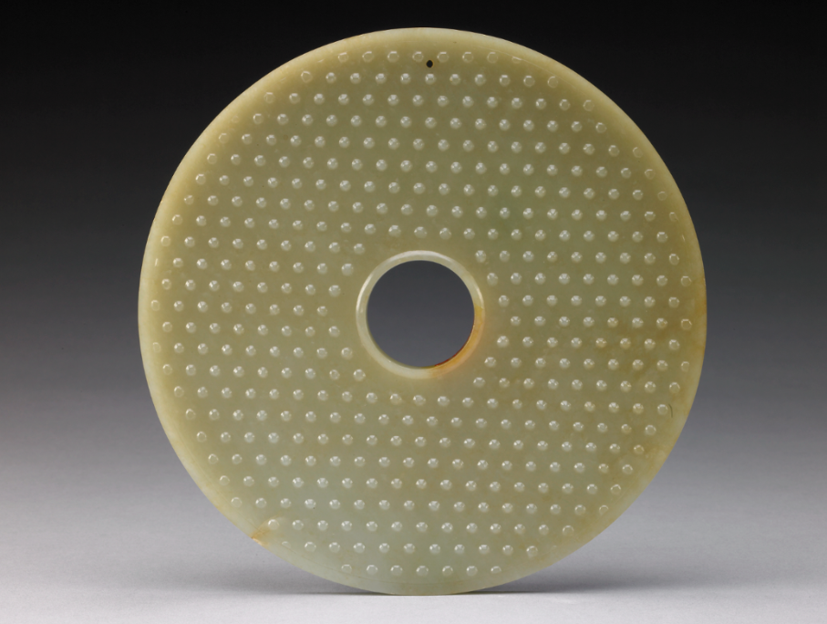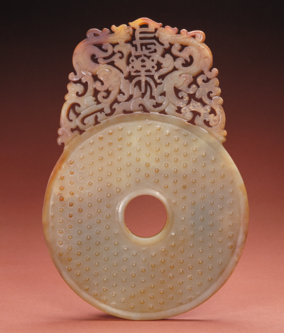 王国维考证殷墟卜辞中的“禮”字为会意字,意为“盛玉以奉神人”。可见礼与玉有着密切关系。玉礼器是礼器中规格最高、地位最显赫的器物,也是礼制文明的载体,在中华礼制文明的起源及其形成过程中,玉礼器扮演了举足轻重的角色。巫鸿先生认为:“礼器艺术品总是需要以当时最先进的技术来制作;这些作品通常是以珍贵与稀少材料制成,而且需要耗费具有技术的工匠的大量劳力。它们往往集各种不同类型的符号(包括原料、形状、装饰和铭文)于一身,以便表达其内涵。”玉璧是汉代最重要的礼仪用玉。古人按照天圆地方的宇宙观, 认为天是圆形,青色的,所以用圆形的青玉璧来礼天,这就是所谓的“苍璧礼天”。玉璧始于新石器时代,兴盛于汉代。