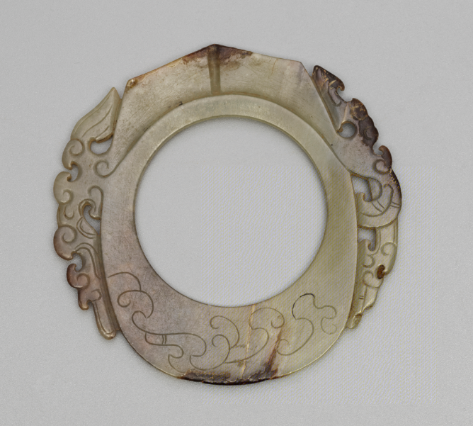 玉璧在我国古代享有崇高的地位,古人在渡河之前,都“沉璧于河”,将玉奉献给 水神,希望神灵能够护佑自己生命的平安,这在中国历史传说中有大量的记载;战国时期秦国为得到赵国的一件“和氏璧”,竟愿以十五所城池换取,使玉璧的价值达到了顶峰,还演绎出“完璧归赵”的千古绝唱。汉代出廓玉璧体现出精美绚丽的气质。造型优美,纹饰流畅,体现汉代玉璧精雕细琢的风格,生动的反映了汉代玉器由礼仪玉器逐渐向实用玉器转变的整体趋势。玉璧在六器之中产生的时间最早、使用的年代最长,是中国古代最重要也是“六器”中最具代表性的器物。