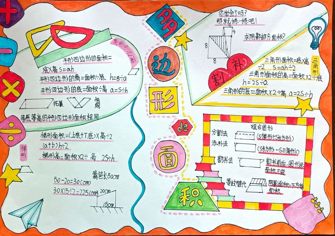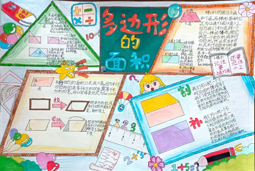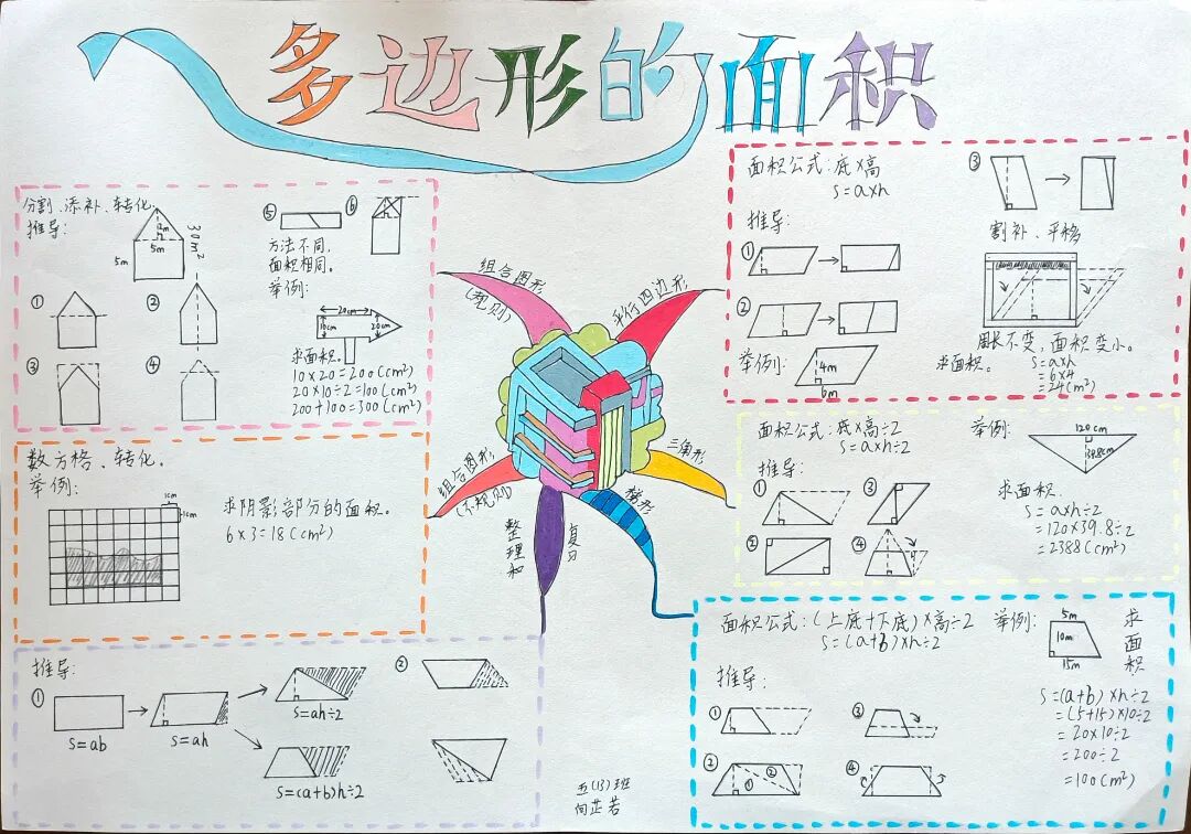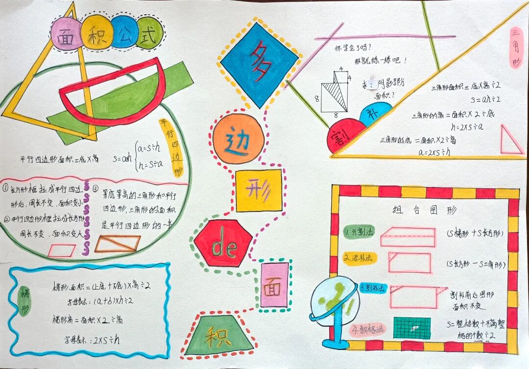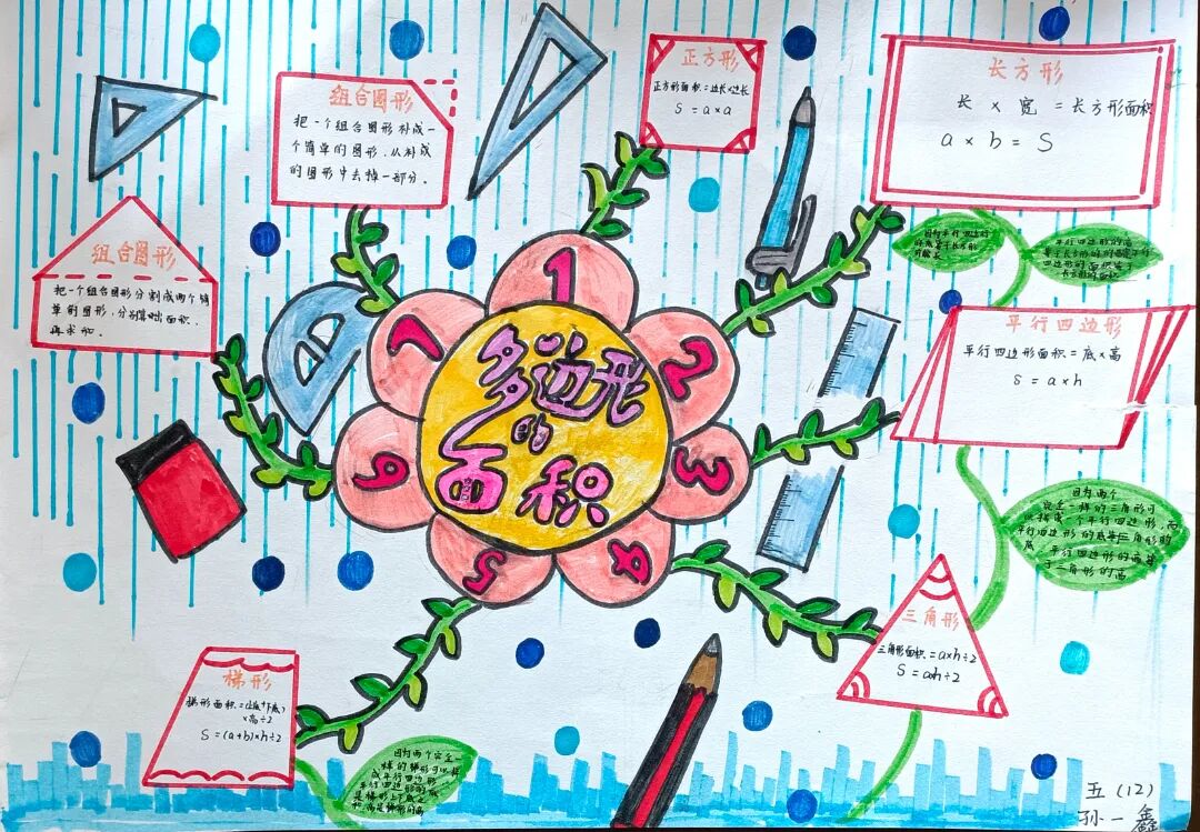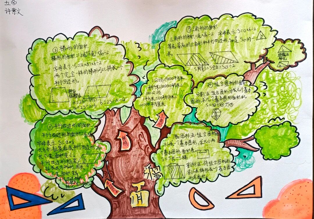 苏霍姆林斯基曾说过:“儿童的智慧在他的指尖上,数学是做出来的。” 在学习完《多边形的面积》这一单元时,我们设计了符合学生年龄特点和学习规律的实践作业——制作思维导图,为学生提供了更多操作、实践的机会,使学生悟出“转化”的数学思想,充分体会面积的测量与计算和实际生活的联系。活动通知如下: 思维导图的制作非常灵活,学生将所学知识与思维导图结合,既巩固了知识,又培养了思维的逻辑性,还促进了学生对数学学科知识的系统整理与深入学习,同时提高了同学们对数学知识的整理能力。我们一起来瞧一瞧学生的成果吧! 数学来源于生活,又高于生活,亦用于生活。学生在本次活动中积累了丰富的活动经验,感受了图形与几何的魅力,体会了数学与实际生活的紧密联系,激发了学生的学习兴趣,提升了学生的数学素养。经过激烈的竞争,共评选出特等奖18名,一等奖25名,二等奖50名。获奖结果公布如下: 编辑:朱俊伟 审核:王跃 审签:许娟![]()