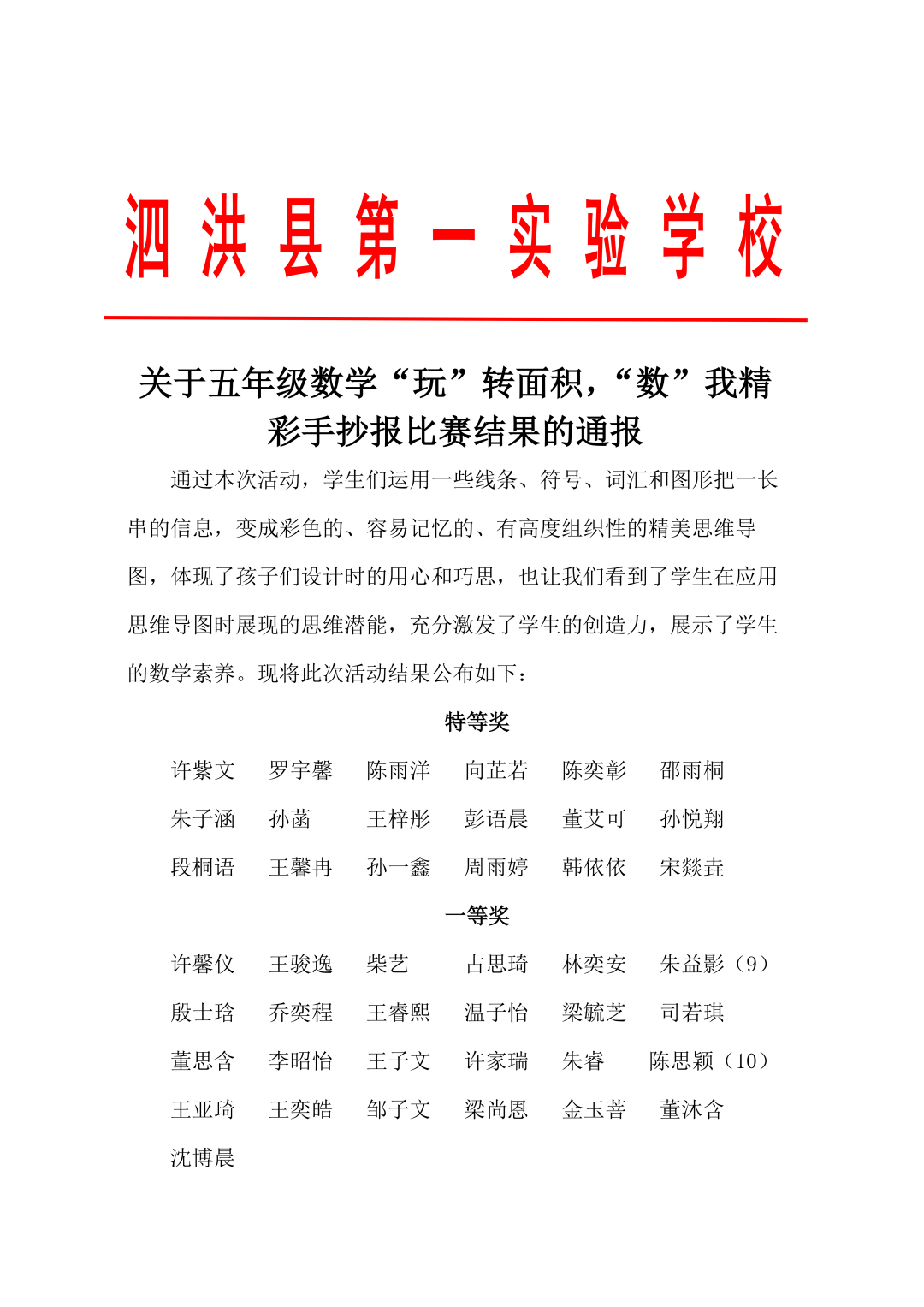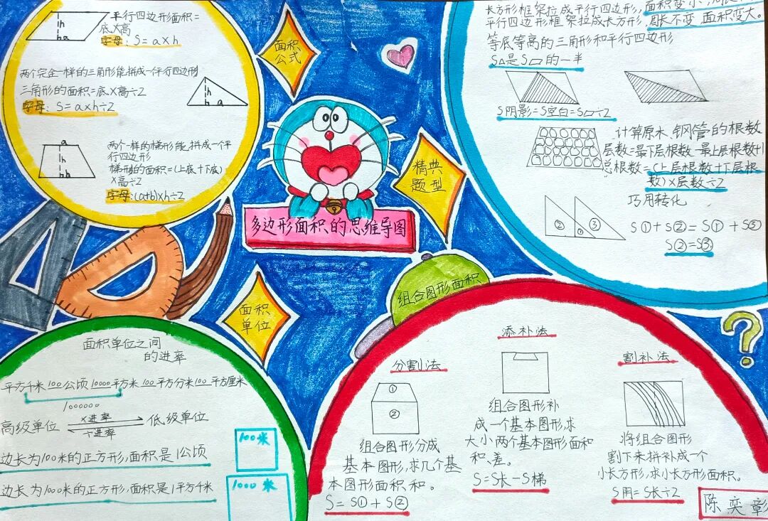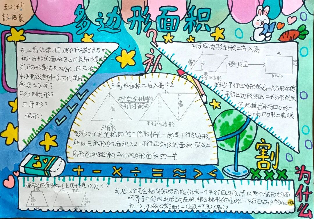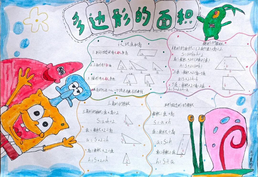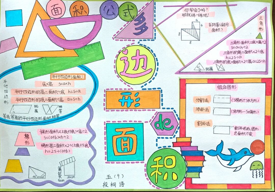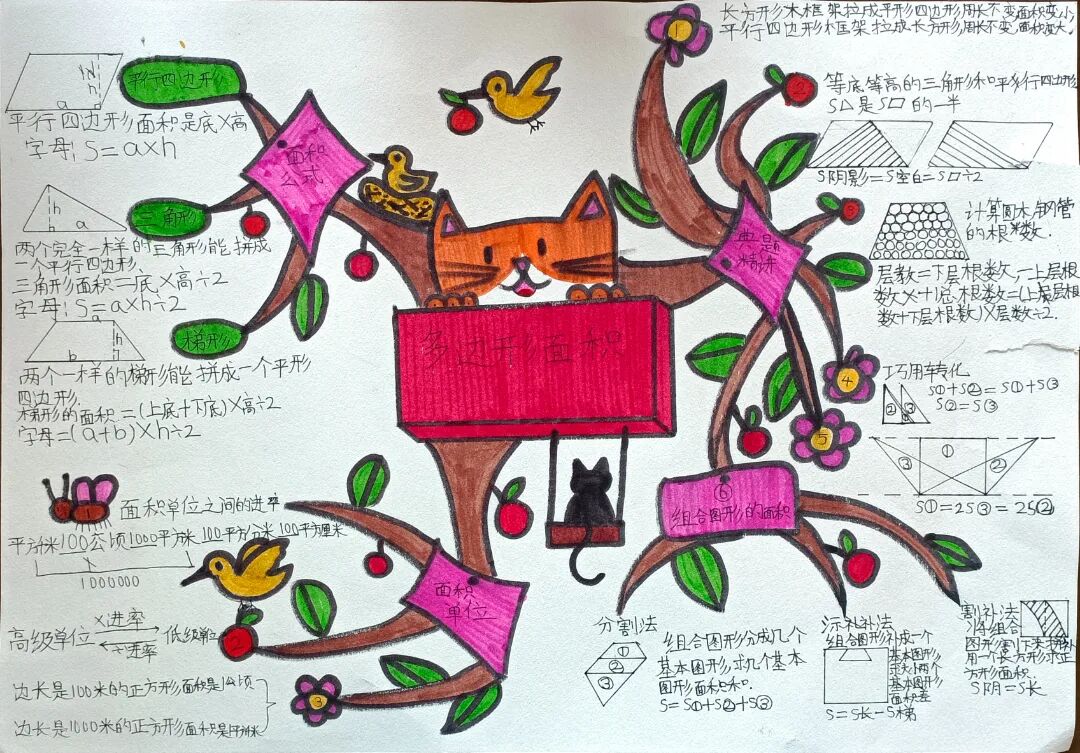 苏霍姆林斯基曾说过:“儿童的智慧在他的指尖上,数学是做出来的。” 在学习完《多边形的面积》这一单元时,我们设计了符合学生年龄特点和学习规律的实践作业——制作思维导图,为学生提供了更多操作、实践的机会,使学生悟出“转化”的数学思想,充分体会面积的测量与计算和实际生活的联系。活动通知如下: 思维导图的制作非常灵活,学生将所学知识与思维导图结合,既巩固了知识,又培养了思维的逻辑性,还促进了学生对数学学科知识的系统整理与深入学习,同时提高了同学们对数学知识的整理能力。我们一起来瞧一瞧学生的成果吧! 数学来源于生活,又高于生活,亦用于生活。学生在本次活动中积累了丰富的活动经验,感受了图形与几何的魅力,体会了数学与实际生活的紧密联系,激发了学生的学习兴趣,提升了学生的数学素养。经过激烈的竞争,共评选出特等奖18名,一等奖25名,二等奖50名。获奖结果公布如下: 编辑:朱俊伟 审核:王跃 审签:许娟![]()