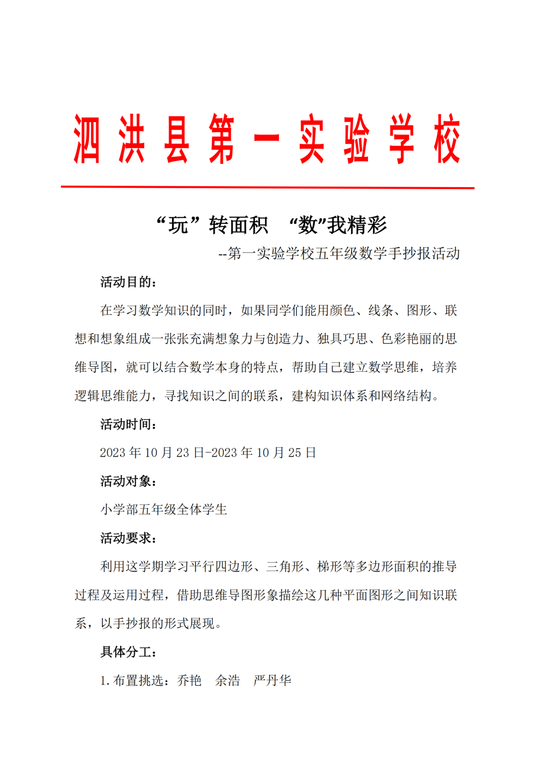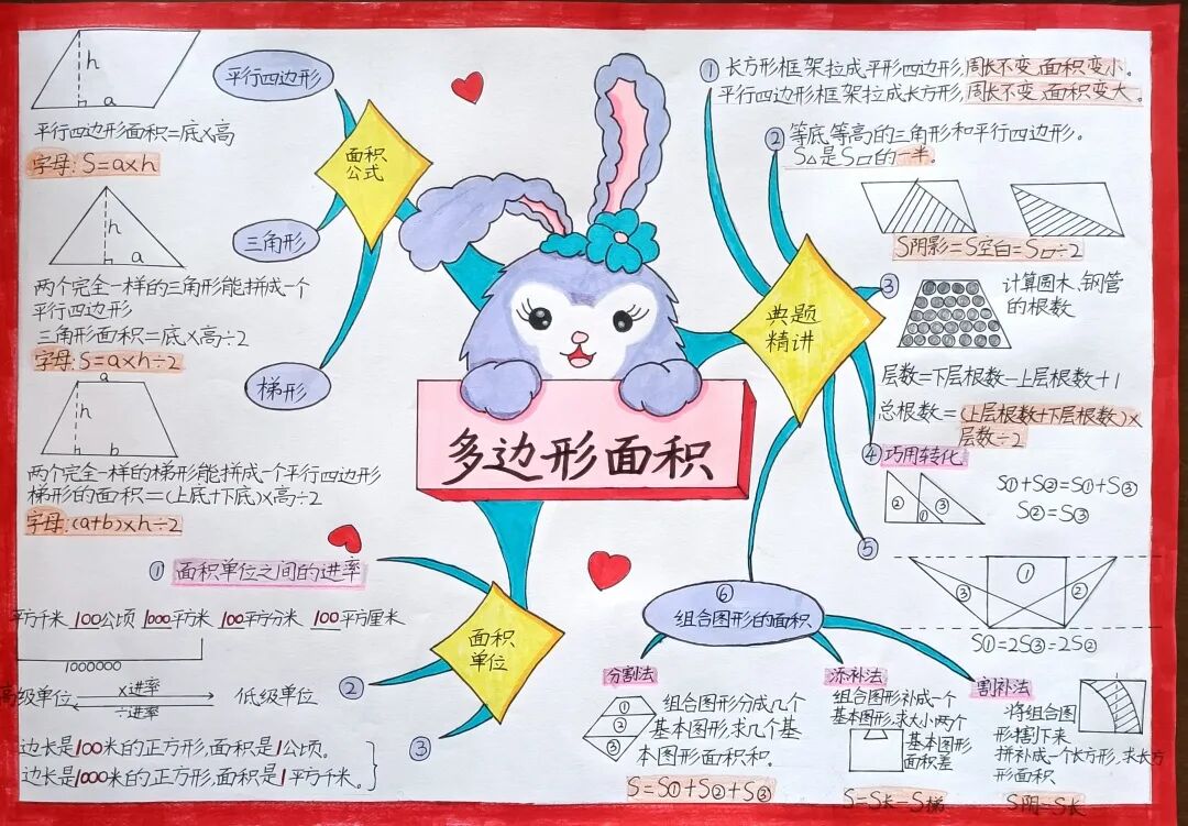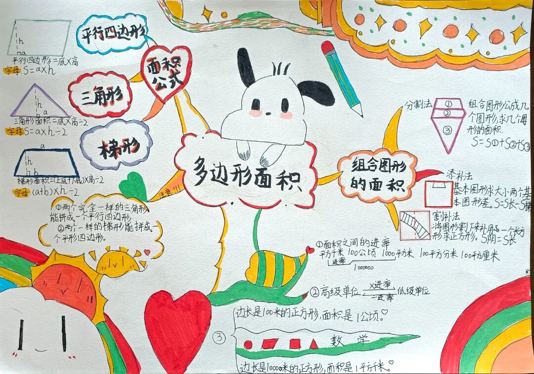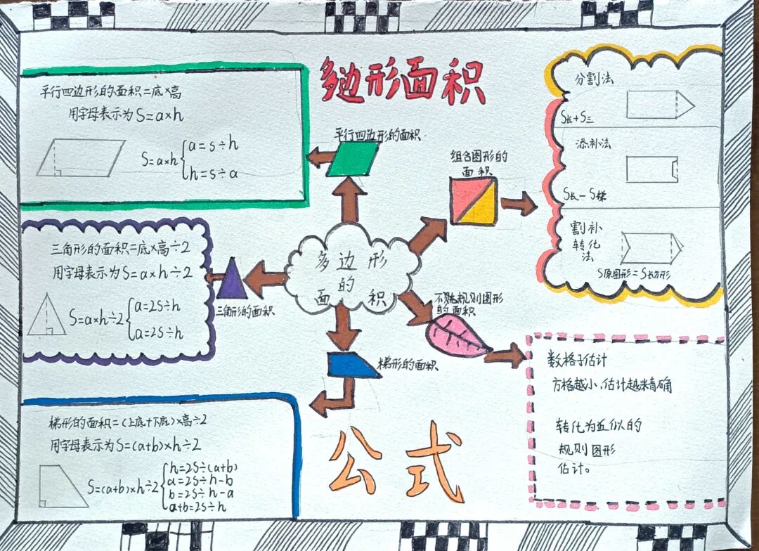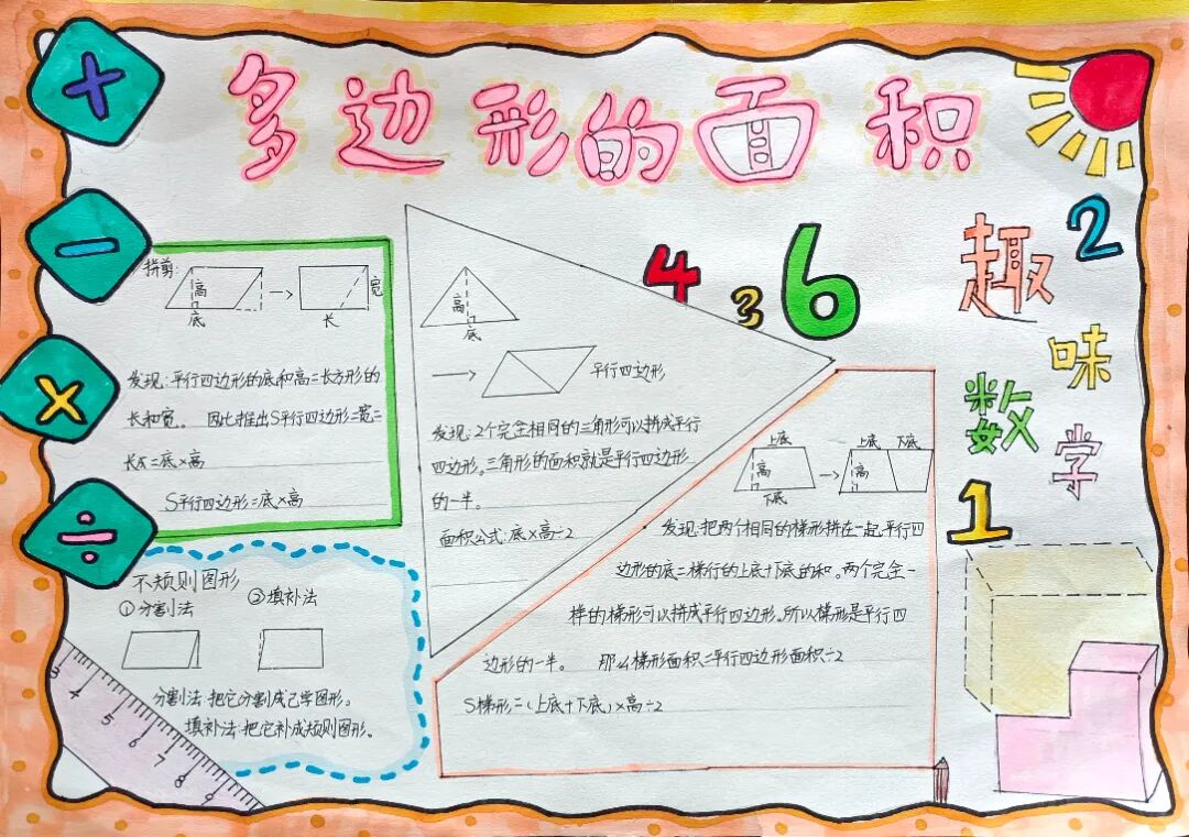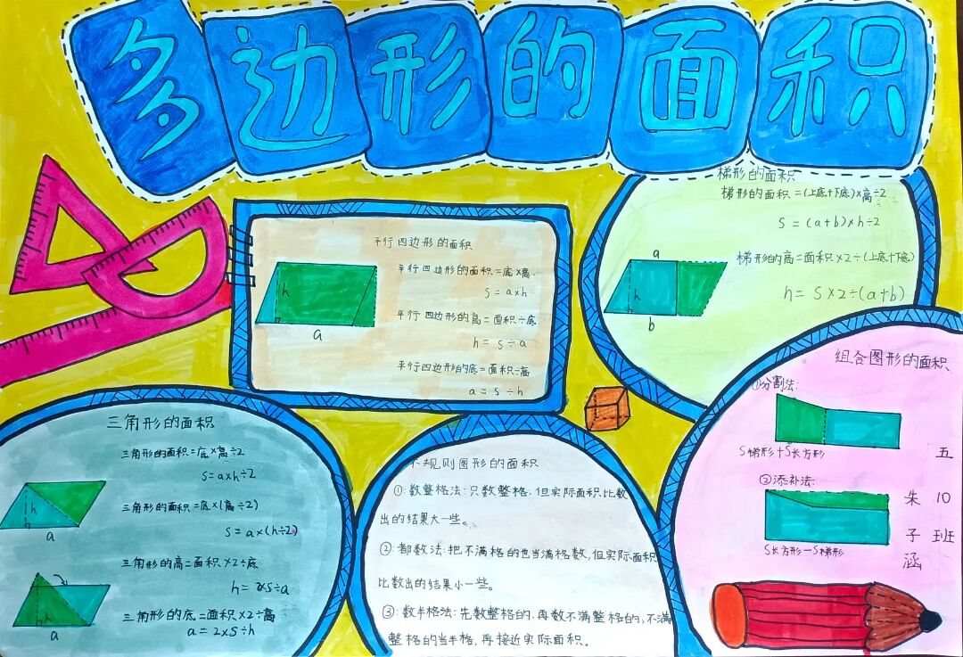 苏霍姆林斯基曾说过:“儿童的智慧在他的指尖上,数学是做出来的。” 在学习完《多边形的面积》这一单元时,我们设计了符合学生年龄特点和学习规律的实践作业——制作思维导图,为学生提供了更多操作、实践的机会,使学生悟出“转化”的数学思想,充分体会面积的测量与计算和实际生活的联系。活动通知如下: 思维导图的制作非常灵活,学生将所学知识与思维导图结合,既巩固了知识,又培养了思维的逻辑性,还促进了学生对数学学科知识的系统整理与深入学习,同时提高了同学们对数学知识的整理能力。我们一起来瞧一瞧学生的成果吧! 数学来源于生活,又高于生活,亦用于生活。学生在本次活动中积累了丰富的活动经验,感受了图形与几何的魅力,体会了数学与实际生活的紧密联系,激发了学生的学习兴趣,提升了学生的数学素养。经过激烈的竞争,共评选出特等奖18名,一等奖25名,二等奖50名。获奖结果公布如下: 编辑:朱俊伟 审核:王跃 审签:许娟![]()