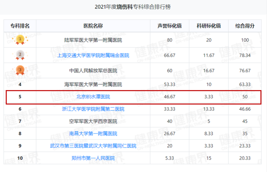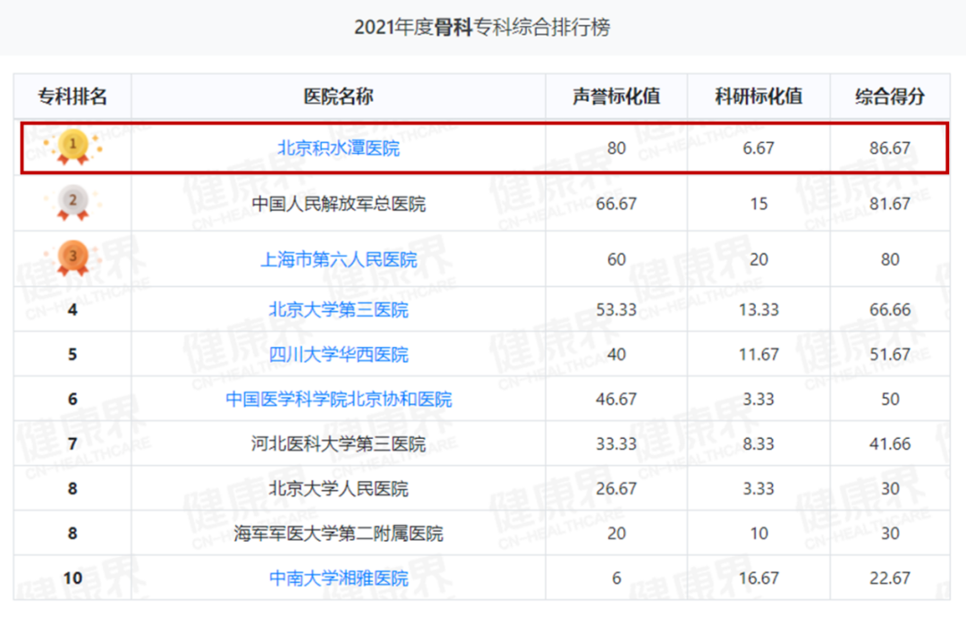 喜 报 2022年11月20日,复旦版2021年度中国医院排行榜在上海发布。北京积水潭医院连续13年在骨科专科声誉排行榜、骨科专科综合排行榜蝉联榜首。 复旦版中国医院排行 在医院专科排名中,北京积水潭医院骨科自该榜设立以来已经连续13年蝉联第一名,烧伤科综合排名也稳居前五。排行榜是衡量医院学科建设、科研发展和院级管理水平的一把标尺,医院将秉承“精诚 精艺 精心”的精神,不断创新,推进医院高质量建设,为健康中国建设贡献力量。 END