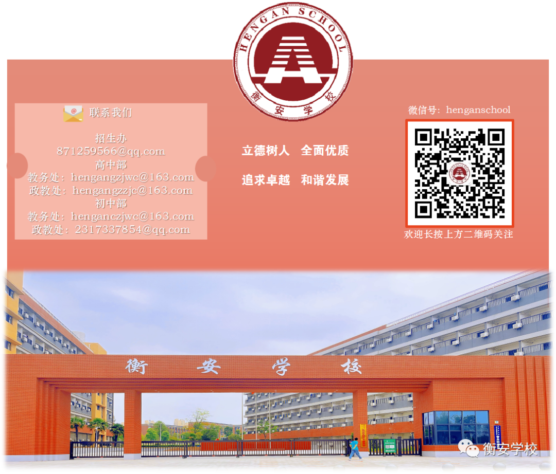 衡安学校始终坚持立德树人的基本方向,将学科成绩视为学生良好意志品质的有机组成部分,通过举办系列德育活动,着力塑造学生的家国情怀、坚韧意志、感恩品质、竞争精神等道德素养,让学生在学业成长道路上永远不失方向、不言放弃、勇敢拼搏。我们相信,素质教育更能提高升学率。
