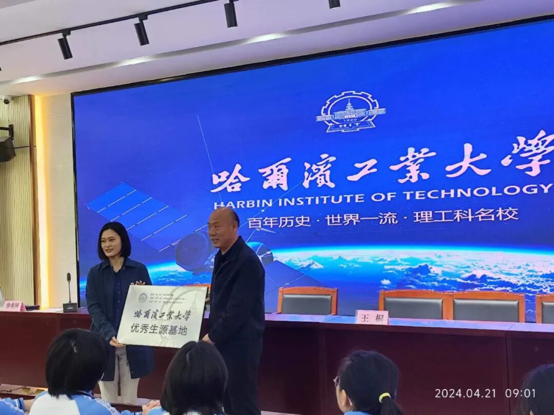 4月21日上午,哈尔滨工业大学优秀生源基地授牌仪式在济南市南山实验高级中学(济南市历城第一中学)隆重举行。哈尔滨工业大学威海校区研学部主任王仲顿、本科招生办老师王桐,济南市南山实验高级中学副校长徐希国出席本次活动。授牌仪式结束后,王桐和王仲顿给