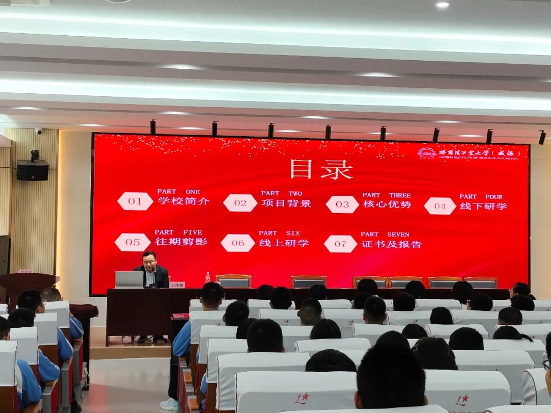 王仲顿从学校简介,项目背景,核心优势,线下研学,往期剪影,线上研学,证书及报告七个方面给学生做了介绍。他还利用多媒体,向现场师生展示了哈工大舒适的校园环境和丰富的校园生活,激发了学生对哈工大的向往之情。