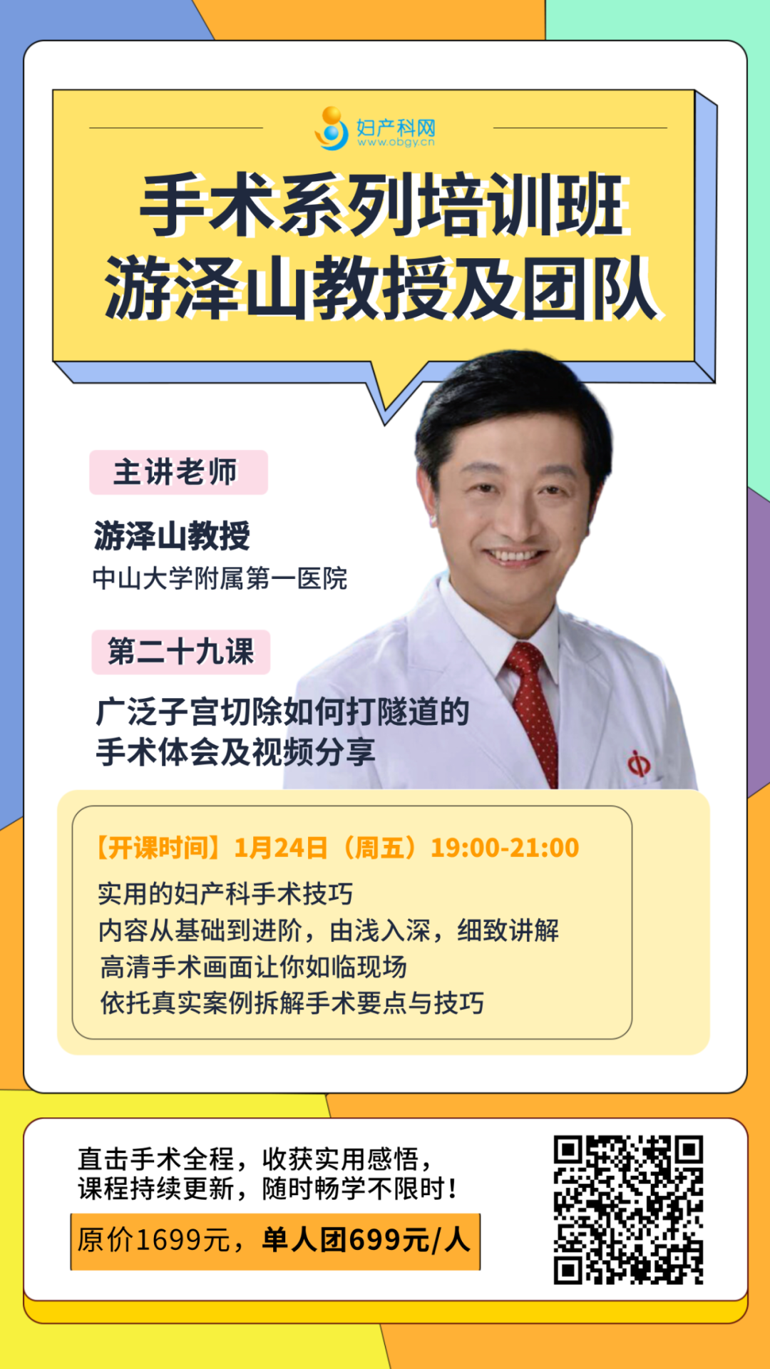 作为一名临床妇产科医生,手术中术野暴露困难、手术刀头难驾驭、输尿管损伤、隐蔽的并发症等等问题是否也曾困扰你? 妇产科学者之家联合游泽山教授团队带来妇产科手术技巧一站式课程集第二期:手术系列培训班,名医指导探讨有关盆底修复、淋巴清扫、子宫切除等内容,由浅入深细致讲解,助力你成为手术领域的佼佼者,是你不容错过的精品课程~ 游泽山教授及团队手术系列自开课以来,广受好评!学员们纷纷表示课程令自己受益匪浅,操作手法干净利落!直播+录播的形式方便回看学习。第二十九课直播课即将上线,每周五持续更新精彩内容,报名后所有课程不限回放时间,相信一定能让大家的技能得到提升! 扫码全部课程立即学习~ 大家都知道,广泛性子宫切除术是早期宫颈癌、Ⅱ期子宫内膜癌等肿瘤手术治疗的主要术式,需要充分游离前方的膀胱、后方的直肠以及两侧的输尿管,从而充分暴露及切除子宫主韧带、子宫骶韧带和阴道旁组织。 本期直播游泽山教授在分享手术视频的同时,也会介绍多年以来积累的手术经验。视野清淅,讲解详细。希望通过手术视频分享,让您在成长的道路上少走弯路。 第一课:盆腔淋巴结清扫的手术体会及视频分享 第二十三课:髂耻韧带悬吊的手术体会及视频分享 第二十四课:腹腔镜下广泛子宫切除手术技巧与质量控制 第二十五课:妇科几个小手术的视频分享及注意事项 第二十六课:开腹腹主动脉旁融合的淋巴团块切除+下腔静脉及右肾静脉修补手术 第二十七课:处女膜闭锁切开整复术及宫颈部分切除的手术视频及经验分享 第二十八课:子宫内膜癌盆腹腔淋巴结切除术 (上下滑动查看) 中山大学附属第一医院妇科主任医师 1984年毕业于中山医科大学医疗系,1992年受聘讲师,1998年受聘副教授,2004年受聘主任医师。 社会兼职:曾任广东省优生优育协会的会长,中山一院东院副院长。现任广东省医学会计划生育分会副主任委员,广东医学教育协会妇产科分会副主任委员,广东精准医学妇产科分会副主任委员。 先后发表医学专业论文70多篇,先后担任和参与多项国家级及省部级科研课题,参编医学专著多部,获医学进步奖一项,获国家专利三项。 专业方向:盆腔器官脱垂,张力性尿失禁,先天性无阴道,子宫内膜异位症,不孕症,妇科良恶性肿瘤等 二级教授、学术型博导、博士后合作导师。现任南方医科大学珠江医院妇产医学中心主任、党支部书记。 兼任中国医疗保健国际交流促进会常务理事、妇产医学分会主任委员,