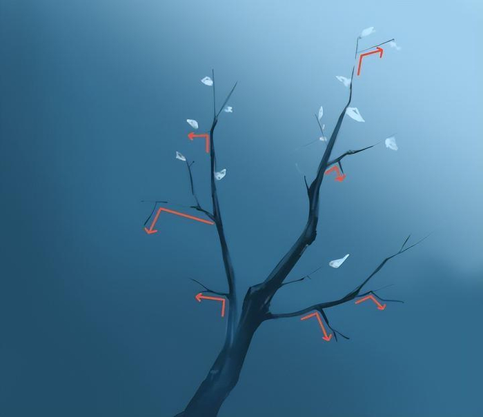 叶子不需要仔细绘制。毕竟,这是一棵死树。叶子比较稀少和破碎。颜色部分的主色是浅蓝色,这样可以看清叶子↑