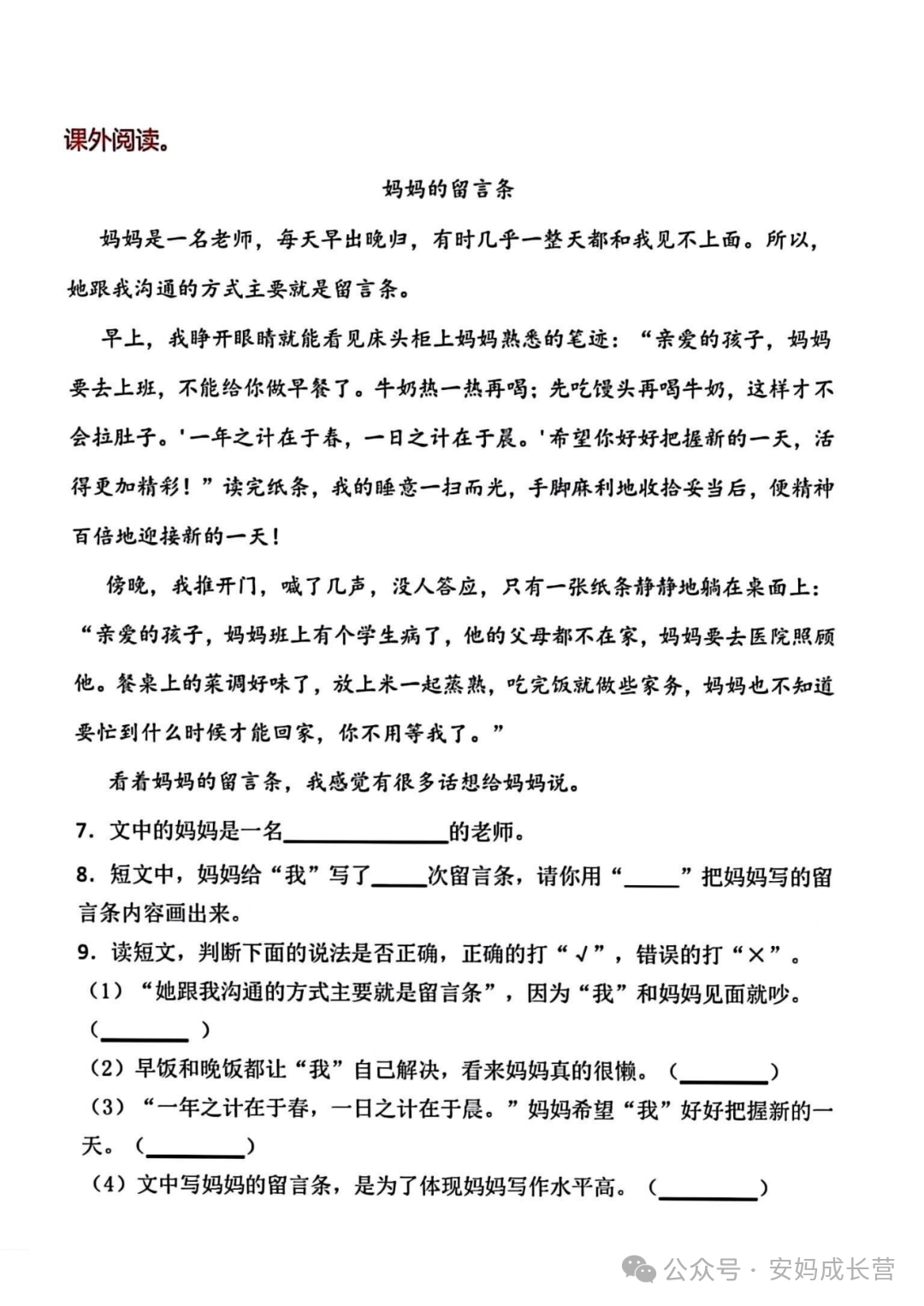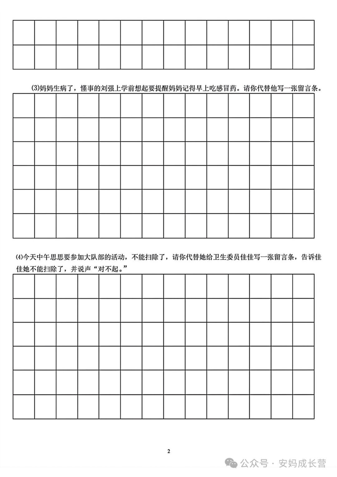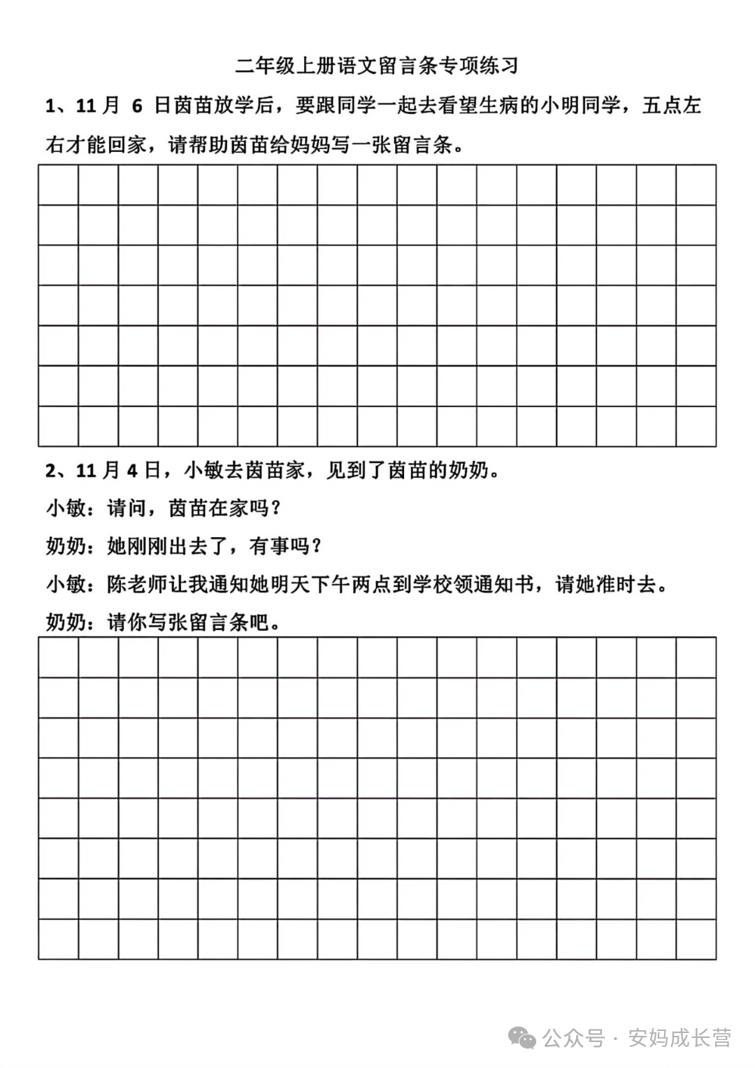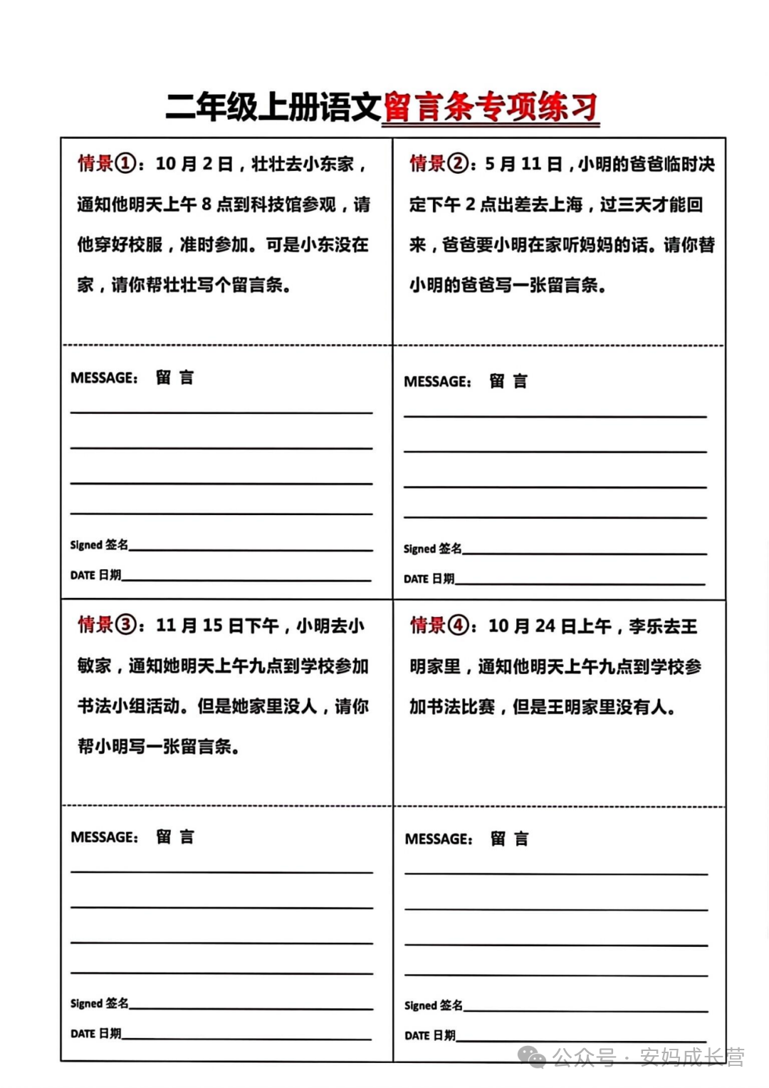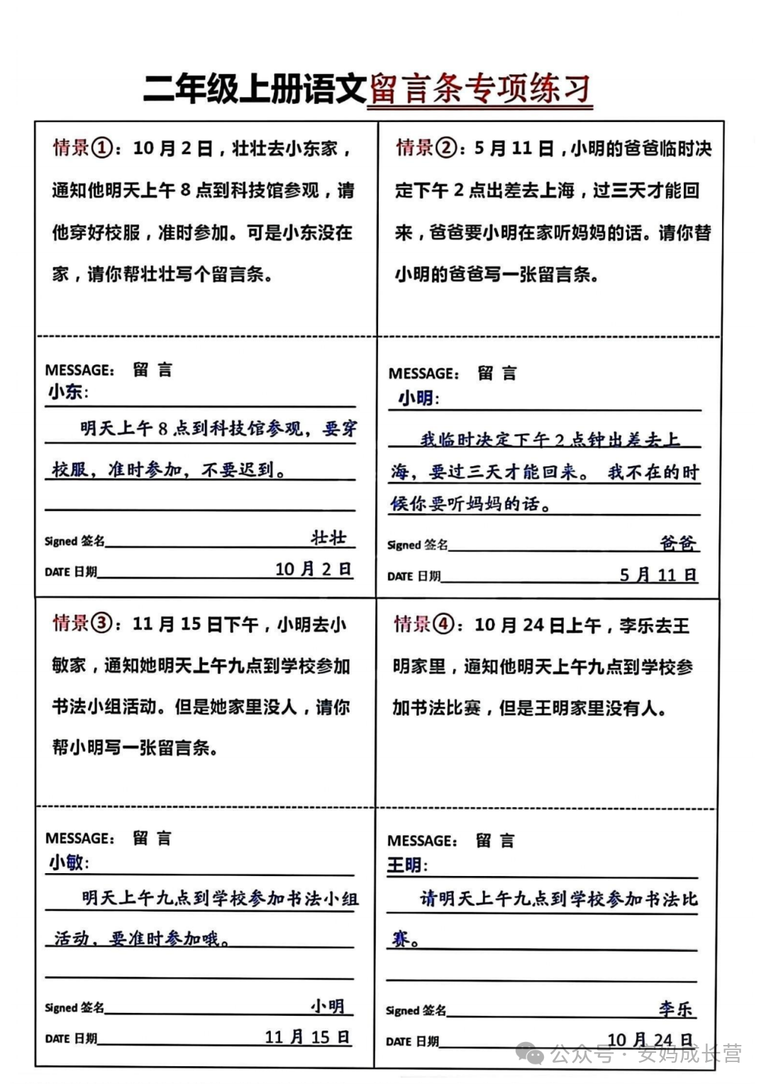 留言条练习 24年二年级上册语文《留言条专项练习》,电子版可打印可下载,通过练习这些二年级上册语文留言条专项练习题,让孩子掌握留言条正确的书写格式,同时也方便孩子在日常生活中沟通使用,需要的家长抓紧打印出来,让孩子练一练吧。 (温馨提示:文末有完整电子版领取方式) 本微信公众账号分享的资源均通过网络等公共合法渠道获得,仅供试用!版权属于原出版机构或影像公司,本资源为电子载体,传播分享仅限于家庭使用与交流心得、参考和辅助购买决策,不得以任何理由在商业行为中使用,若喜欢此资源,建议购买实体产品。文章中的视频及图片均来自网络,版权归原作者或原出版社所有。如有侵权,请及时联系删除。 — END — 想要第一时间看到【微小学语文】的好内容,可以关注我们并设为【星标】哦!这样你就不会错过每一篇文章啦! 整理不易,拿走请点个赞吧~ 下载方式 1、扫下方二维码直接下载 2、点击文末“阅读原文”可直接下载![]()