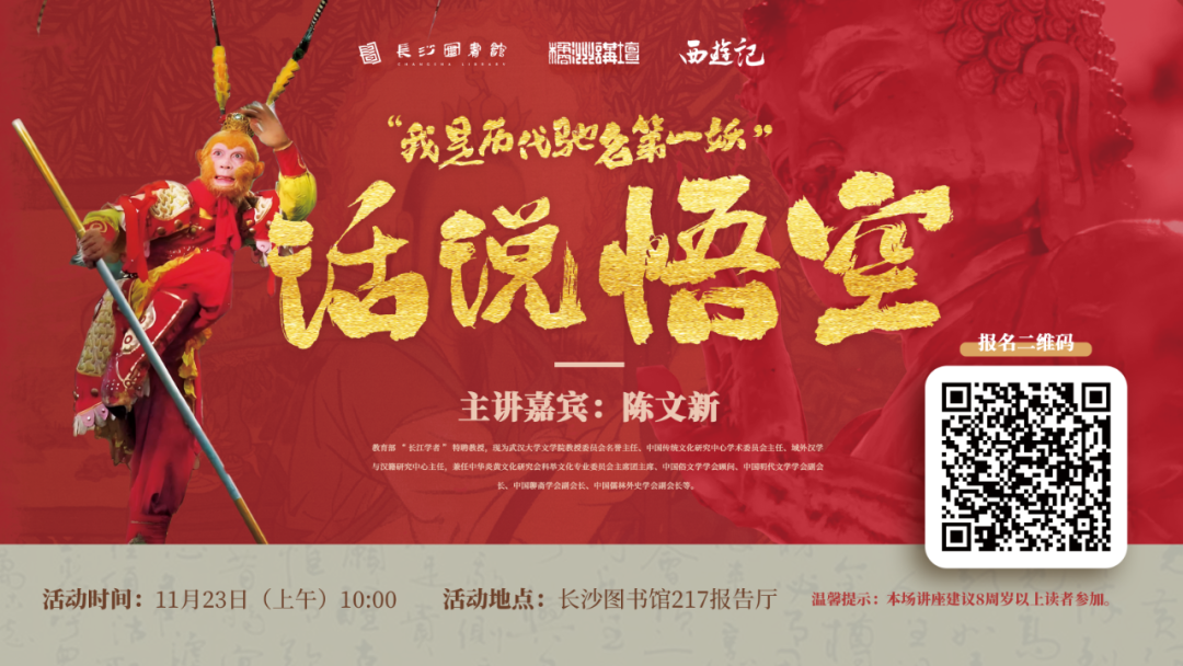11月23日上午,武汉大学陈文新教授做客长沙图书馆橘洲讲坛活动现场,带来主题讲座《话说悟空》,带领读者从《西游记》出发,共同探索童心与成长的奥秘。