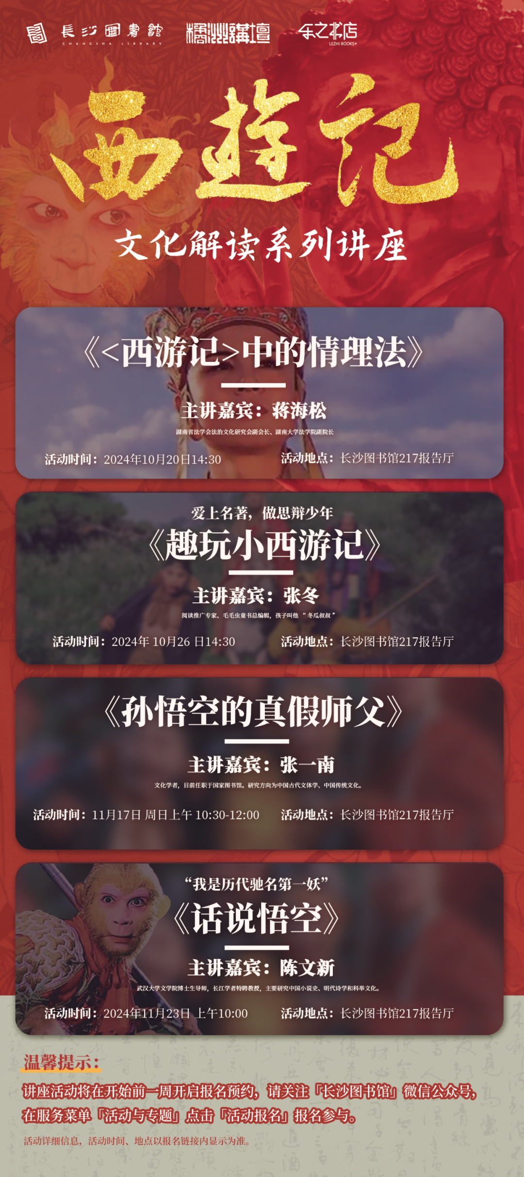 10-11月,长沙图书馆橘洲讲坛陆续推出《西游记》文化解读系列讲座,让广大市民读者从文学、文化、生活、政治角度深度读懂经典。