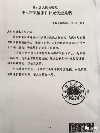 2016 年 8 月 29 日商水县人民检察院没有批准公安局对刘素霞实施逮捕,下达了《不批准逮捕案件补充侦查提纲》,建议公安机关补充:是否存在既往骨折史,是否存在陈旧伤、是否系本次外伤所致,已核实案情。