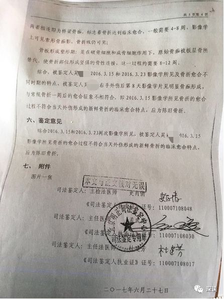 刘素霞向法制晚报·看法新闻记者提供的“司法鉴定书”显示:2017 年 6 月 27 日,北京明正司法鉴定中心鉴定意见为,“被鉴定人吴某某 2016年3.15 影像学所见骨折的愈合过程不符合当天外伤形成的新鲜骨折的临床愈合特点,应为陈旧骨折”。