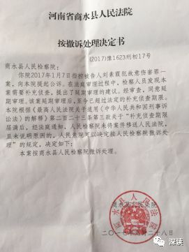 9 月 28 日,商水县人民法院出具《按撤诉处理决定书》称,“法庭审理过程中,检察人员发现本案需要补充侦查,提出了延期审理的建议。该案延期审理后,至今超出法定的补充侦查期限”,宣告此案撤诉。