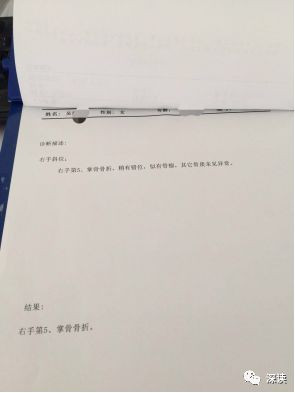 法制晚报·看法新闻记者通过司法鉴定引用资料获悉,吴某某(事发)当天入住商水县人民医院,经诊断右手第五掌骨骨折(X片号DR104212),“稍有错位,似有骨痂”。