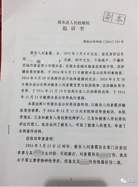 2016 年 11 月 10 日,商水县人民检察院做出批捕决定,取保候审的刘素霞被以涉嫌故意伤害罪逮捕,并于 2016 年 12 月 15 日向商水县人民法院移送审查起诉。
