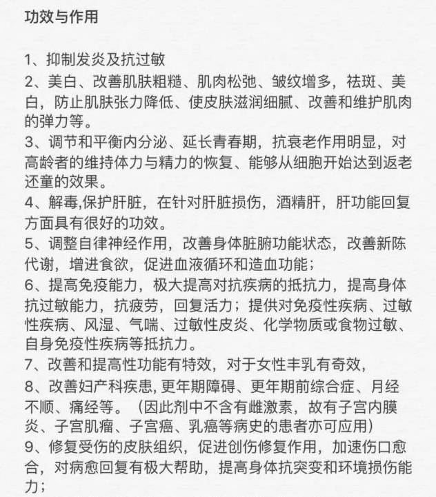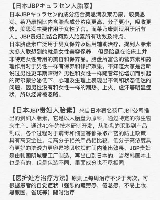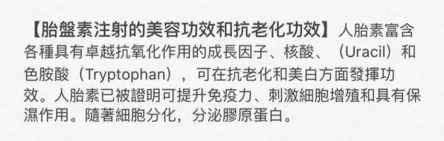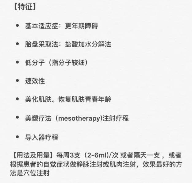 因为几乎一切关于延缓衰老、改善皮肤、抗皱袪皱、美白、色斑沉淀、颜面潮红、毛细孔扩张、青春痘等皮肤问题,胎盘素都对之有明显的疗效。对於美容:越年轻注射,效果越好,受益早(定格青春)对於抗衰治疗:年龄越大效果越明显(如延缓更年期的到来)。胎盘对女人的好大家都懂吧!
