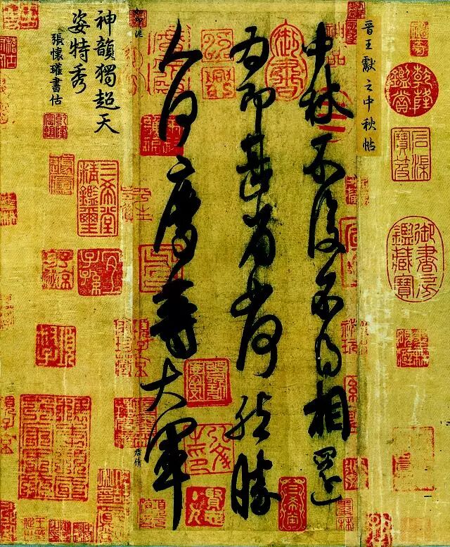 关于中秋书法,最著名的,当然是王献之《中秋帖》了。现藏故宫博物院的《中秋帖》,与王羲之的《快雪时晴帖》,王珣的《伯远帖》合称“三希”,足见该作品地位。《书断》认为:“字之体势,一笔而成,偶有不连,而脉不断,及其连者,气候通其隔行”。《中秋帖》书法纵逸豪放,应是王献之创造的新体。作品如下: